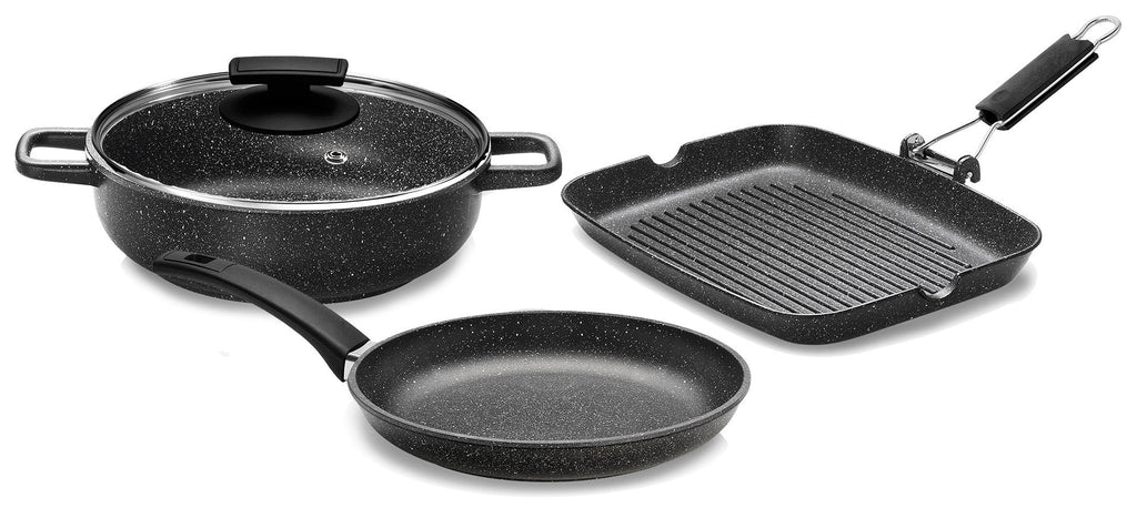 CUISSON EN FER . La batterie de cuisine commercialement appelée « STONE » n'est pas pour nous une mode passagère mais une vraie qualité ! Collection de poêles , casseroles , cocottes et grills fabriqués en aluminium moulé sous pression * , technologie qui permet d'obtenir des épaisseurs différenciées, plus importantes dans le fond pour répartir et maintenir la chaleur uniformément, même après avoir retiré la poêle de la flamme, ce qui signifie homogène cuisson et des économies d'énergie considérables.