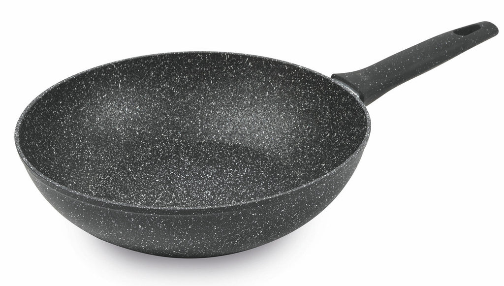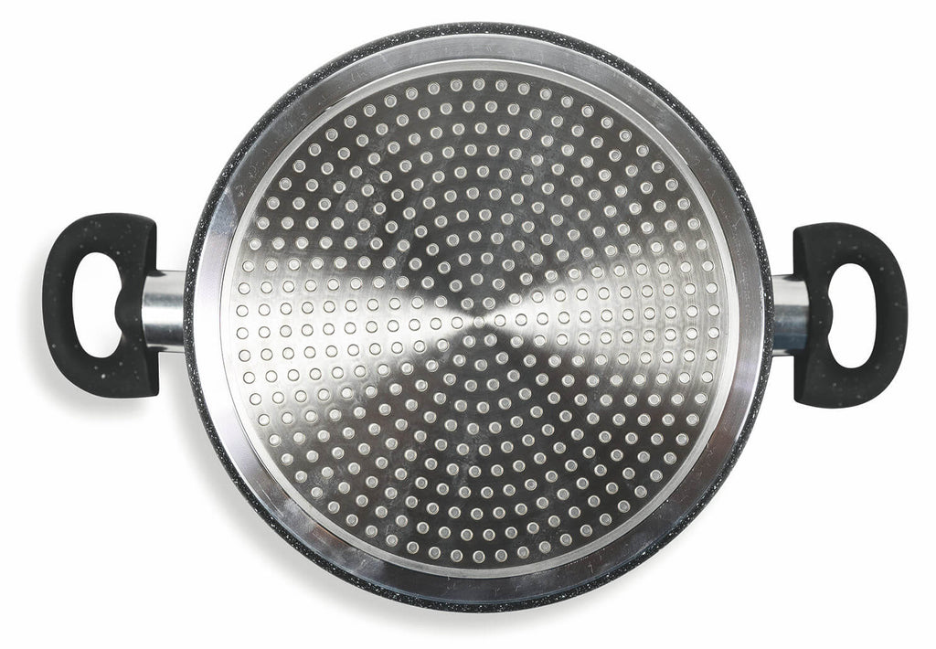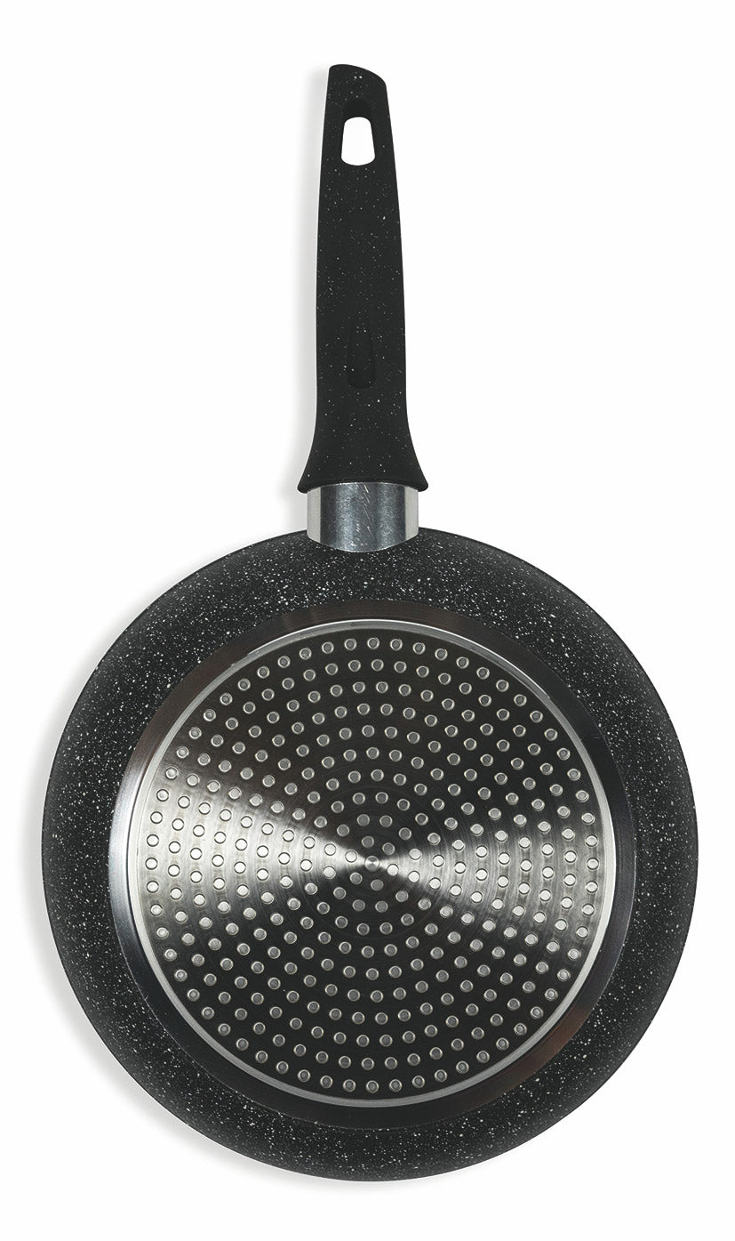 Revêtement exclusif effet PIERRE ultra-résistant aux rayures et à l'abrasion. Hautes performances antiadhésives sans ajout de graisses et d'huiles.