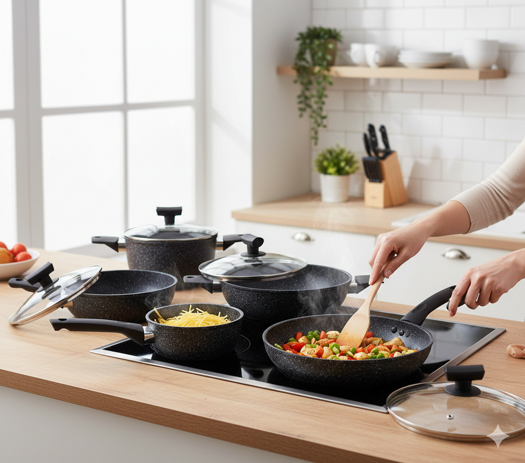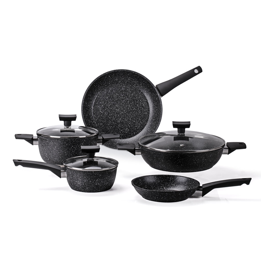 Batteria di Pentole 8 Pezzi Antiaderente Induzione in Alluminio Effetto Pietra Moneta Magnolia Stone Black