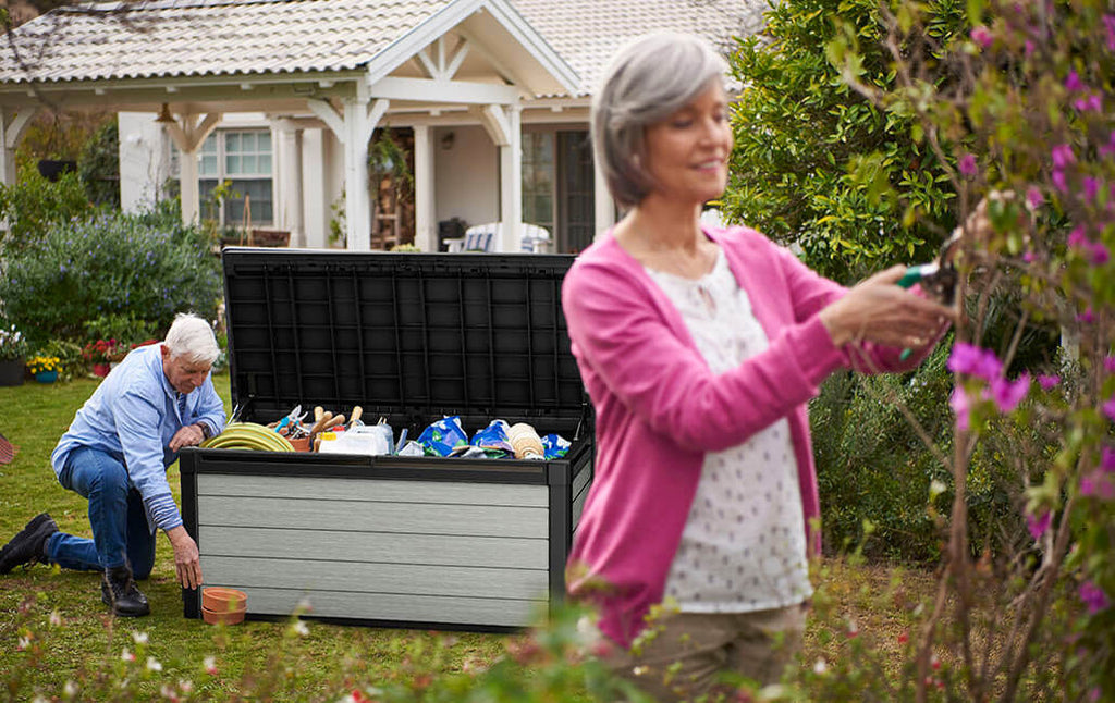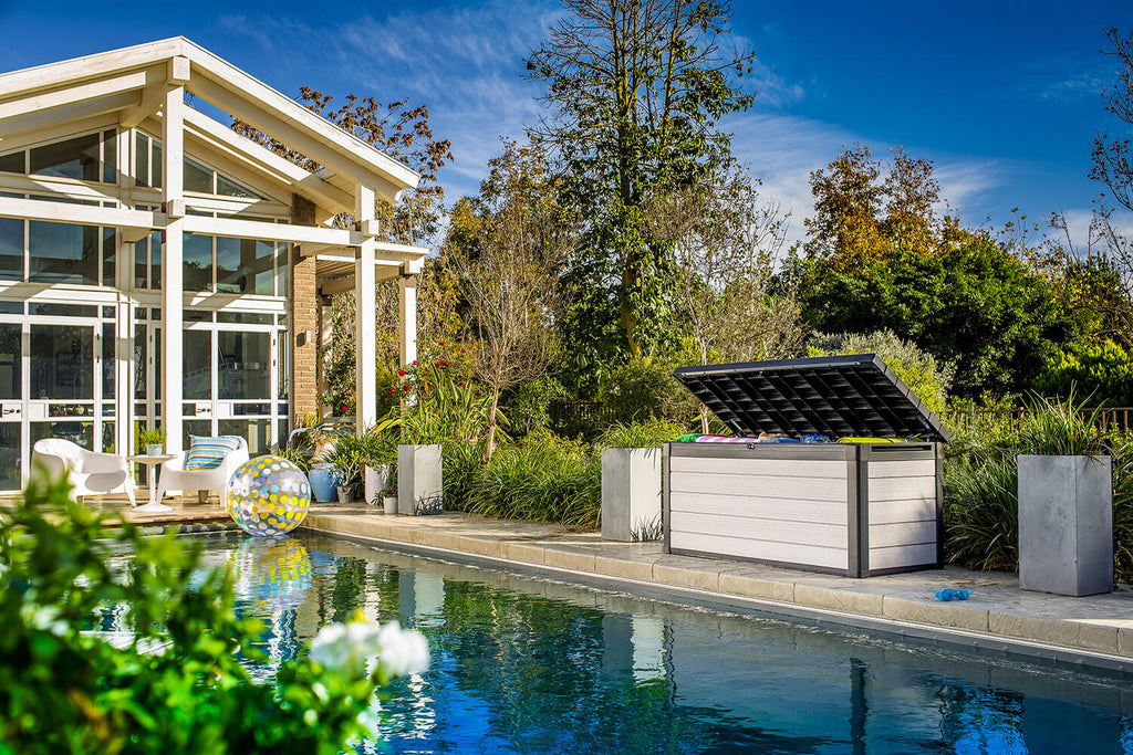Coffre d'extérieur 151x72,5x70 cm en résine DUOTECH effet bois Keter Denali gris