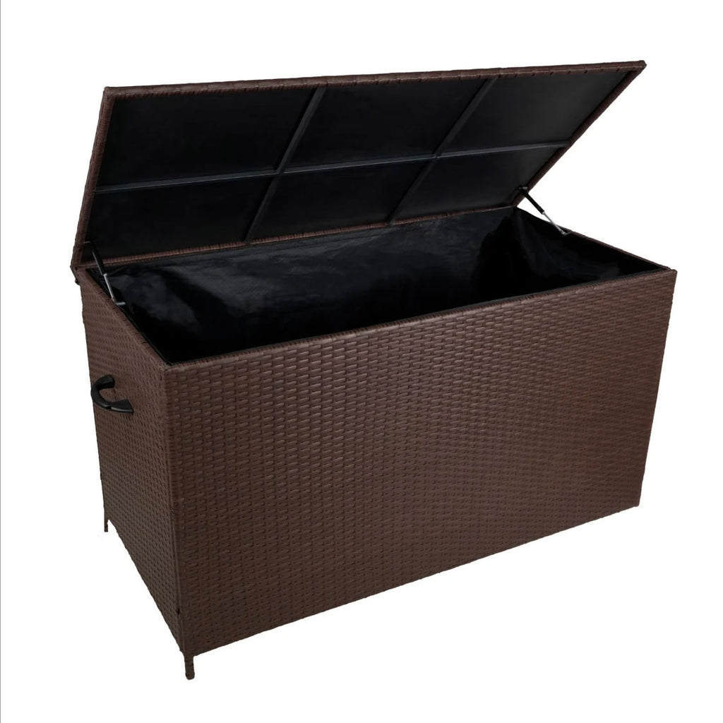 Con una generosa capacità di 582 litri, questo baule sapientemente realizzato è il complemento ideale per il nostro set da giardino in rattan, fornendo una confortevole sistemazione per tutti i cuscini. Ciò ne assicura la protezione durante i mesi più freddi e piovosi, mantenendoli asciutti e in condizioni impeccabili.