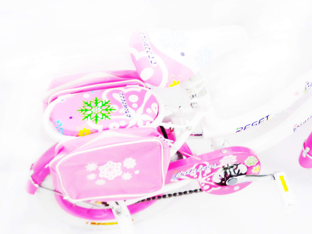 Vélo fille 12" 2 freins avec panier et sacoches latérales blanches et roses