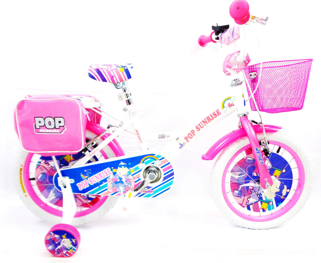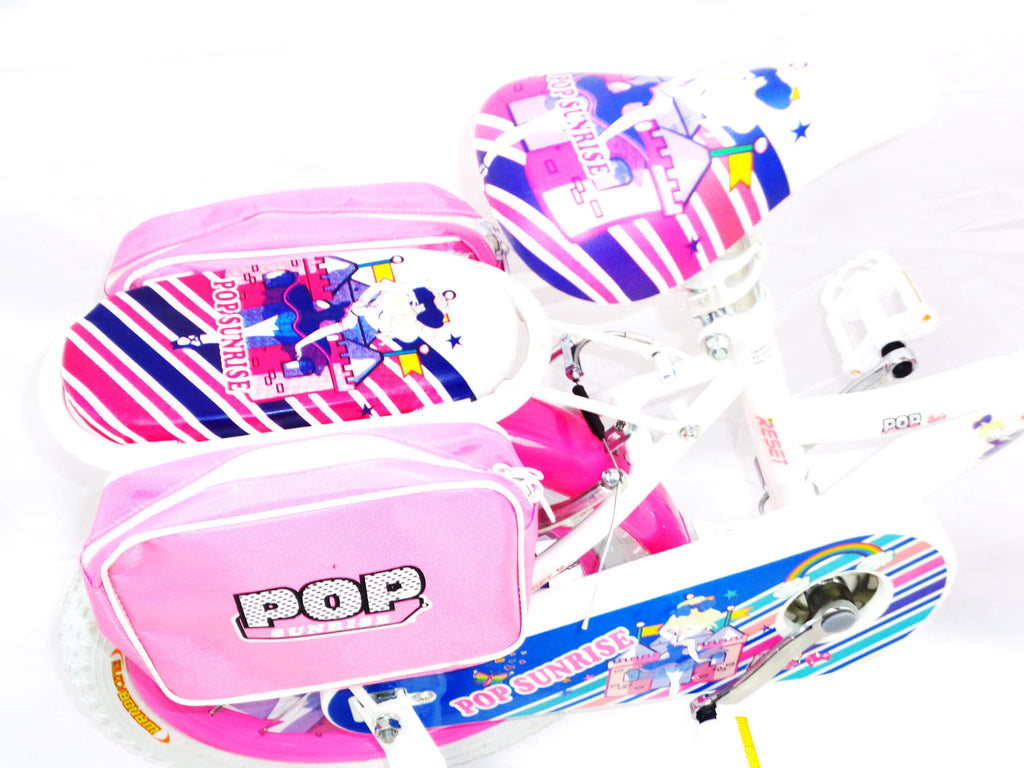 Vélo fille 12" 2 freins avec panier et sacoches latérales blanches et roses
