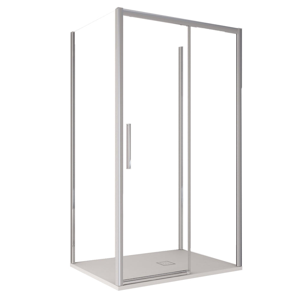 Cabine de douche à trois côtés avec profilés chromés, porte coulissante équipée d' une fermeture magnétique pour une parfaite étanchéité à l'eau, cristal de 6 mm avec traitement anti-calcaire qui empêche la formation de calcaire et facilite le nettoyage en permettant l' élimination des impuretés uniquement avec de l'eau chaude. Il vous permet de faire des économies en n'ayant plus à acheter des produits spécifiques. Peut être installé au ras du sol ou sur un receveur de douche . Roues en acier inoxydable et téflon.