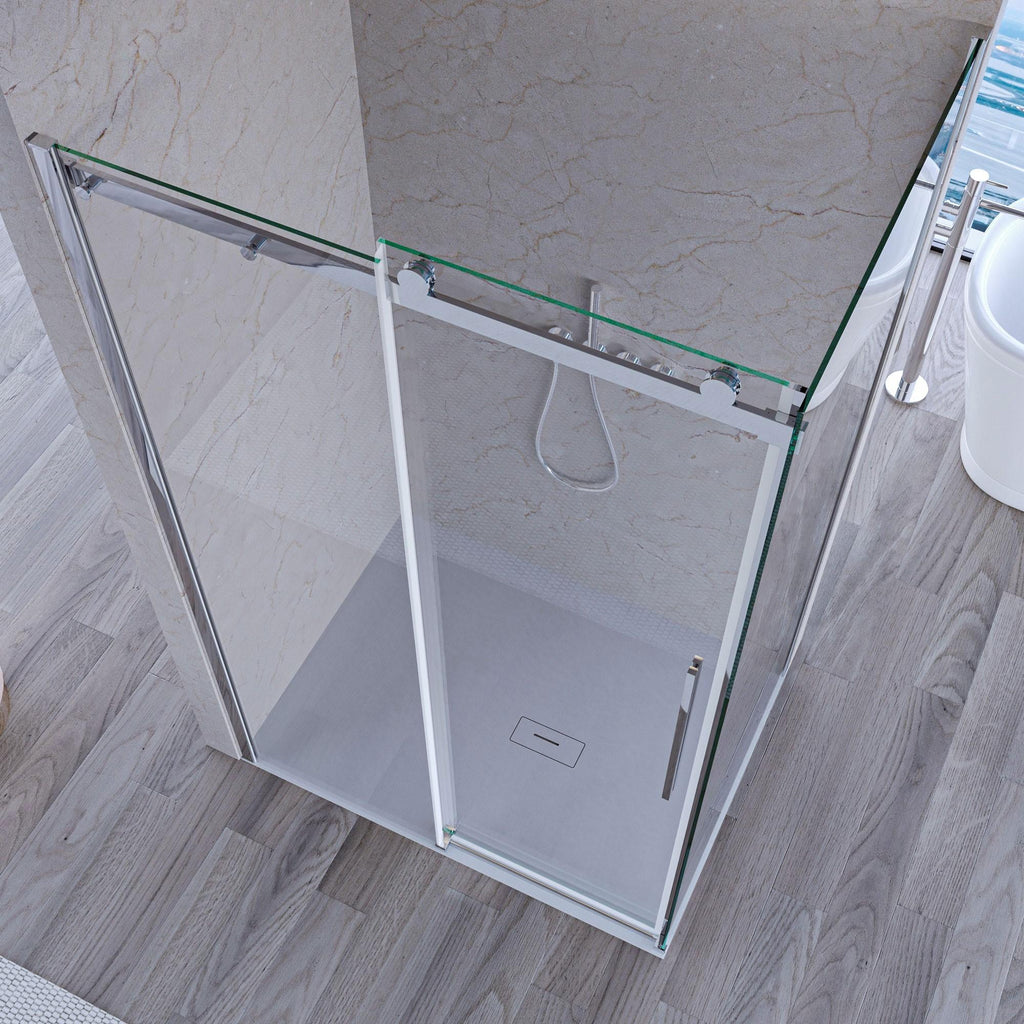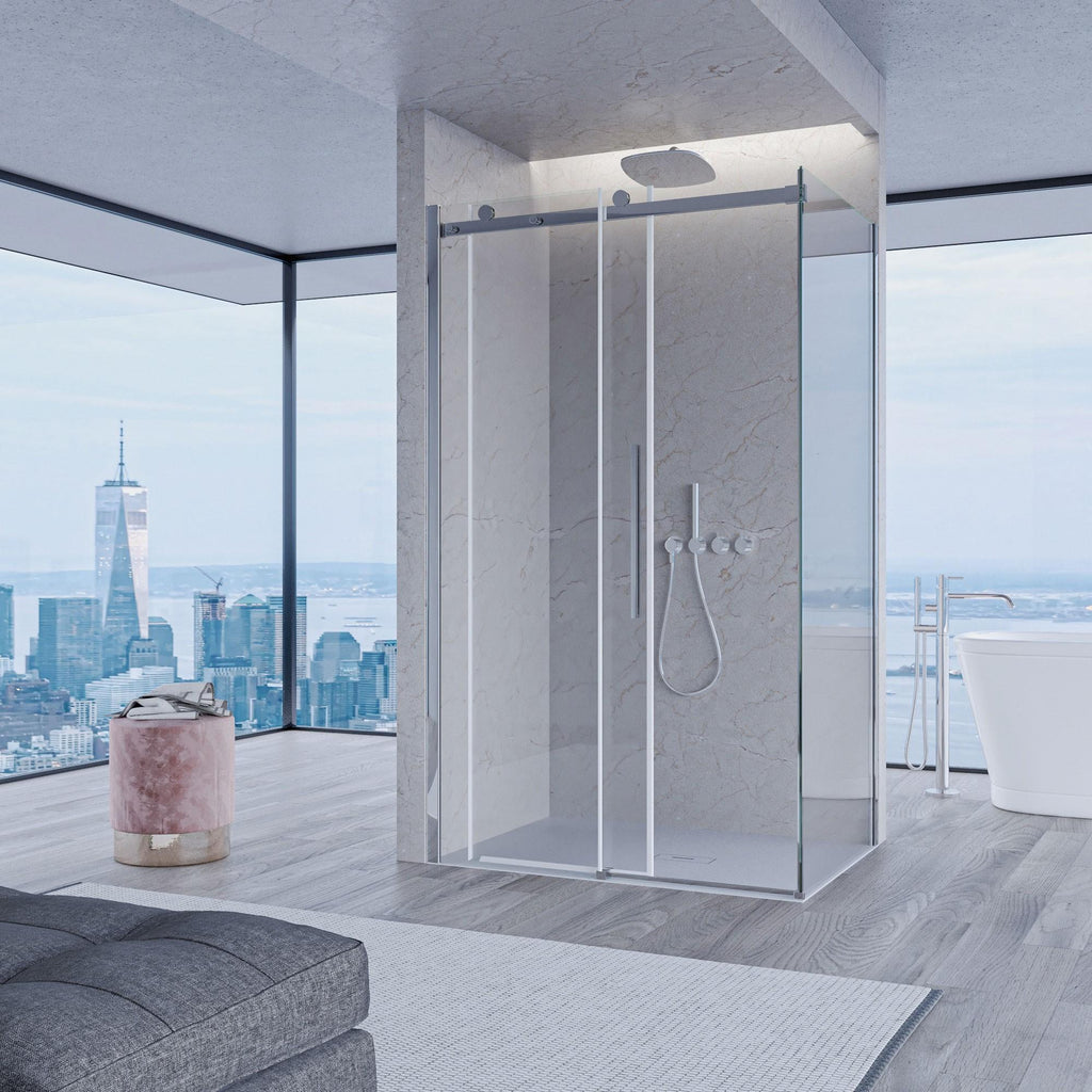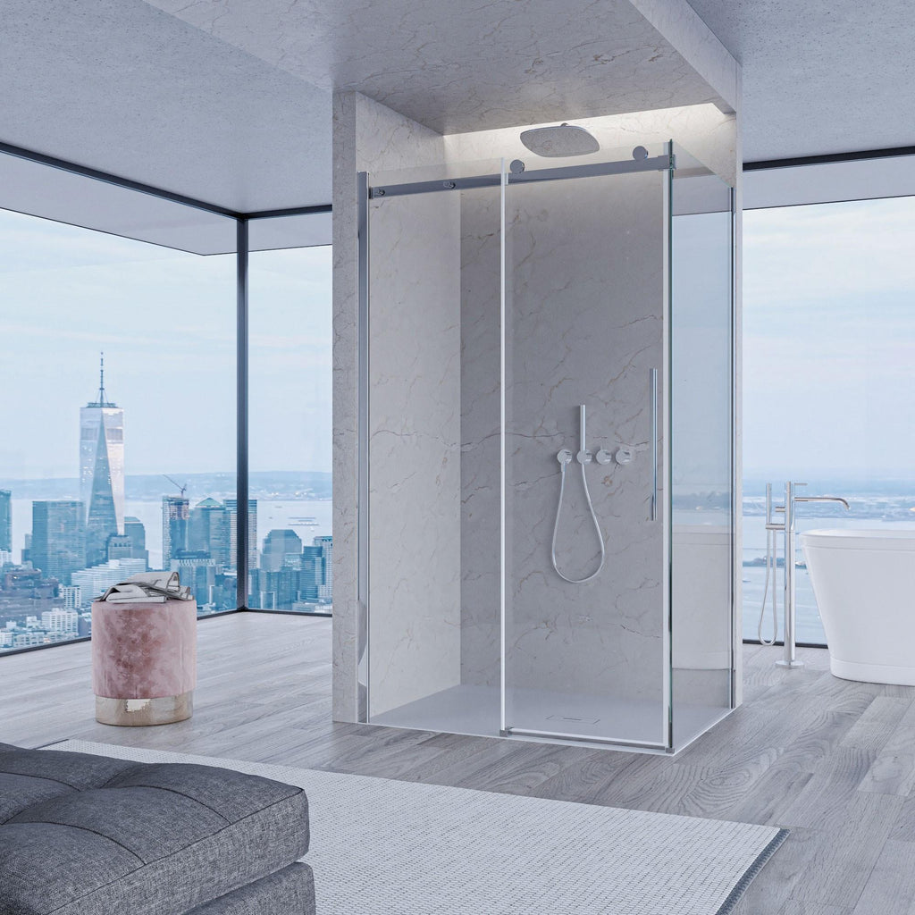 Cabine de douche double face H195 avec porte coulissante et côté fixe, la perfection absolue se trouve dans les détails de ce merveilleux produit. La poignée en acier inoxydable de 50 cm donne à la porte une touche d'esthétique pure et minimaliste. Fermeture magnétique avec aimant de fermeture placé à l'intérieur d'un élégant profilé en aluminium qui préserve son intégrité à vie. Anticalcaire externe interne pour préserver et éviter la formation de calcaire permanent.