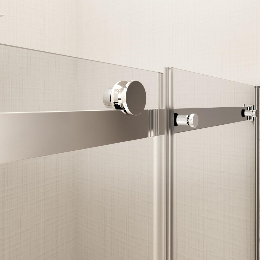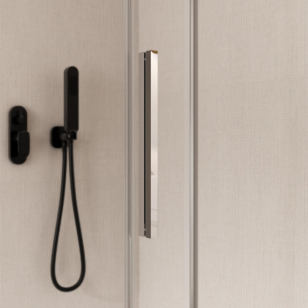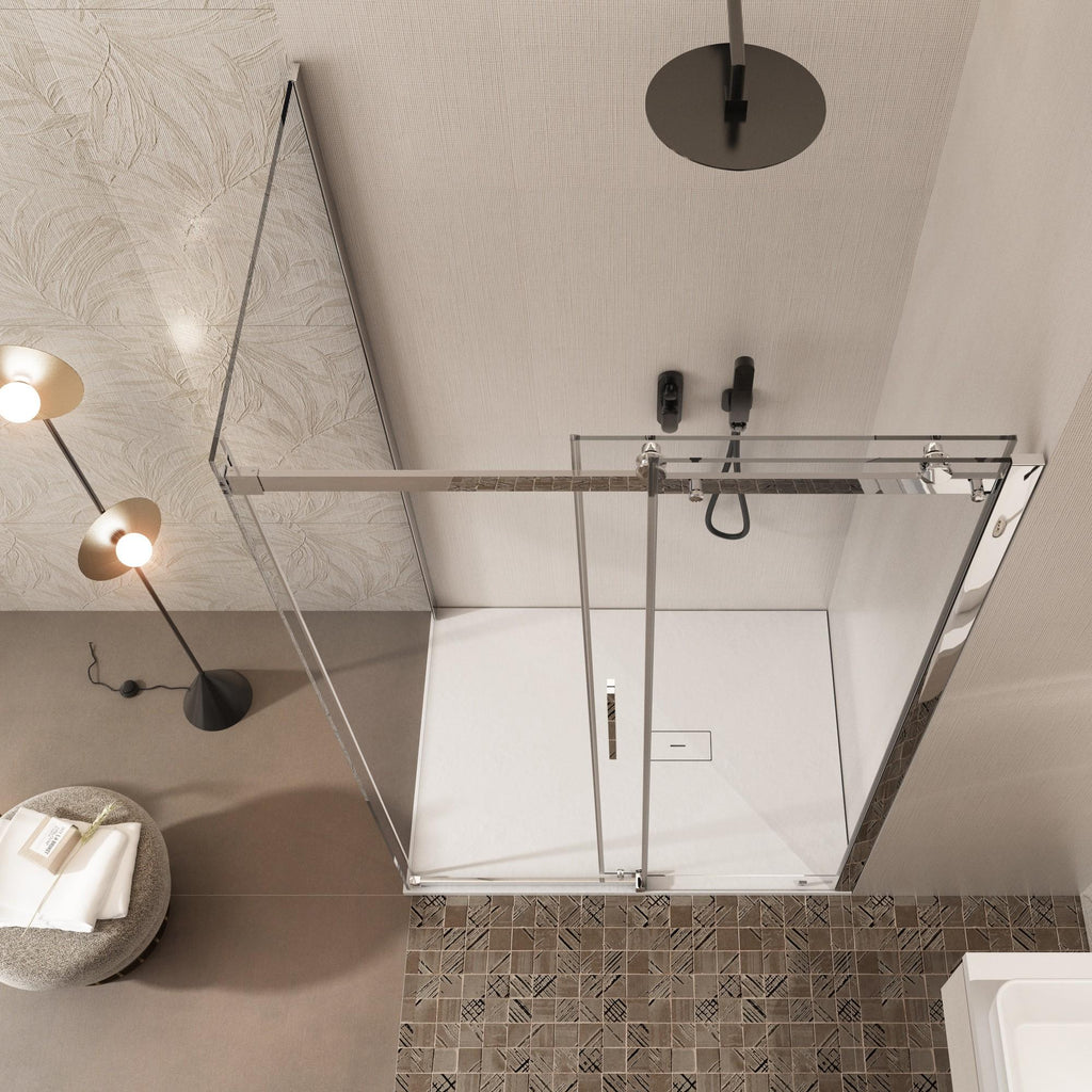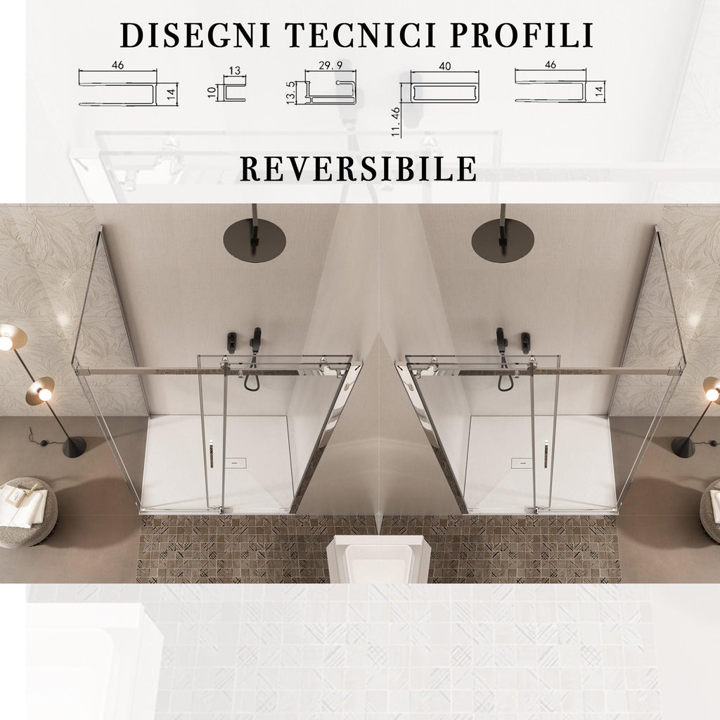 Cabine de douche double face avec porte coulissante Elise 3.0 une nouvelle génération de cabines de douche de luxe. Verre trempé certifié ISO hauteur 195cm épaisseur 8mm avec traitement anti-calcaire externe total interne appliqué au four. Roues en laiton chromé avec roulements en acier inoxydable Aisi 304, rail fin en aluminium, fermeture magnétique avec profil transparent. Fixation du verre avec système caché sans vis.