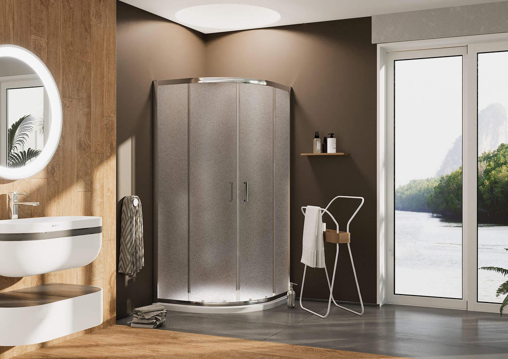 - Cabine de douche d'angle semi-circulaire composée de 2 portes fixes et 2 portes coulissantes
