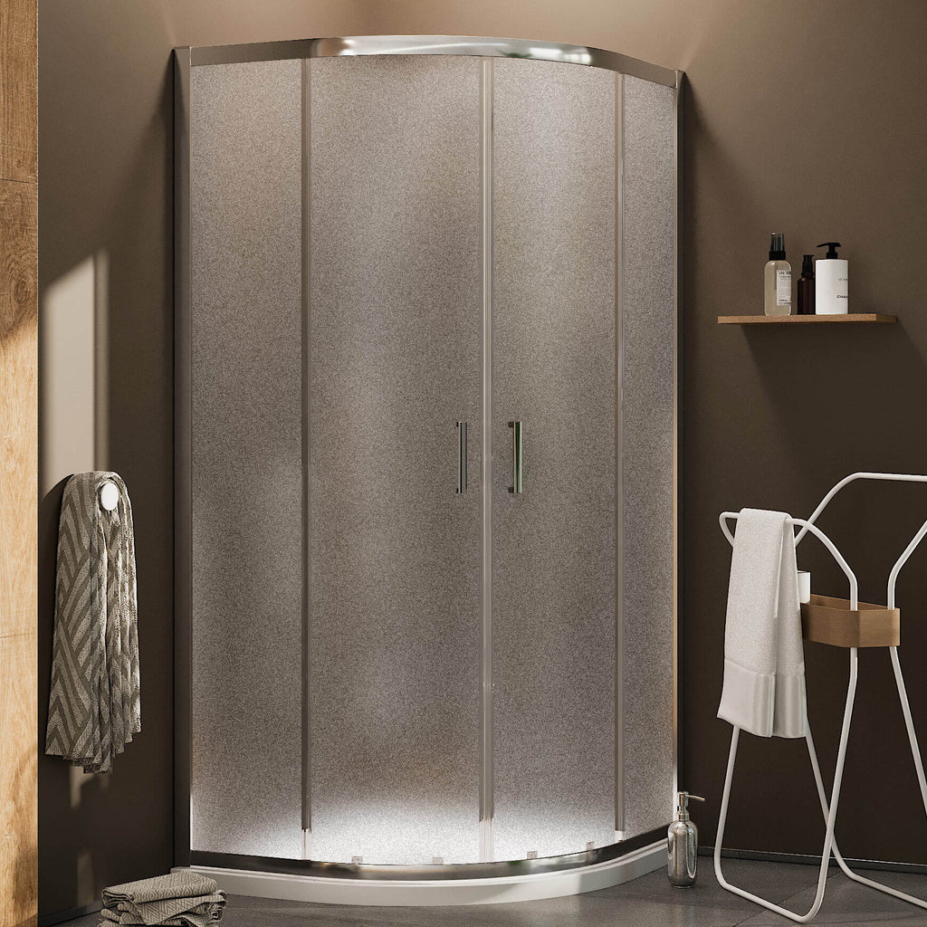 - Cabine de douche d'angle semi-circulaire composée de 2 portes fixes et 2 portes coulissantes