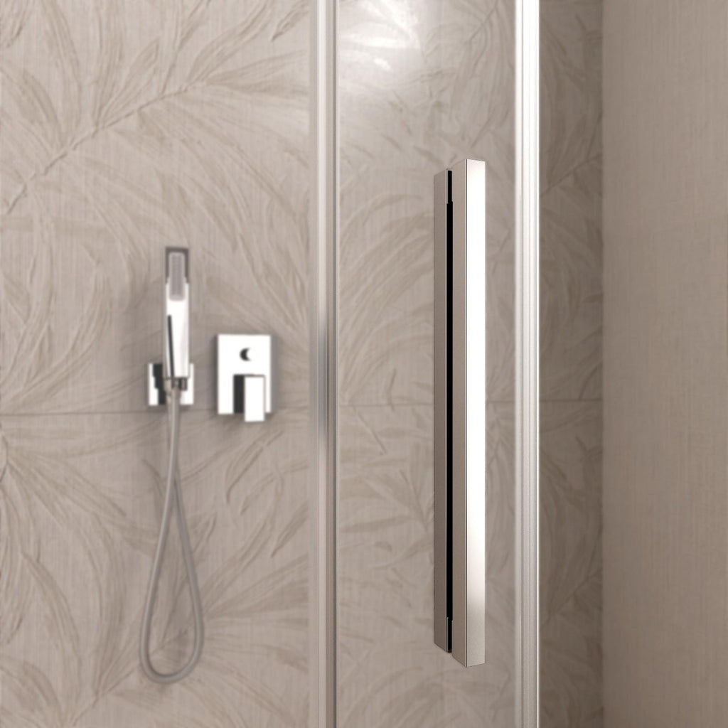 Cette cabine de douche à deux côtés présente les caractéristiques d'une cabine de douche haut de gamme, se positionnant dans le segment des produits de luxe. Cabine de douche équipée de composants conçus pour durer dans le temps. Aluminium chromé anodisé semi-brillant. Poignées en acier inoxydable Aisi 304. Traitement anti-calcaire appliqué dans le four Nano K1. Cristaux trempés certifiés ISO conformément aux normes CE.