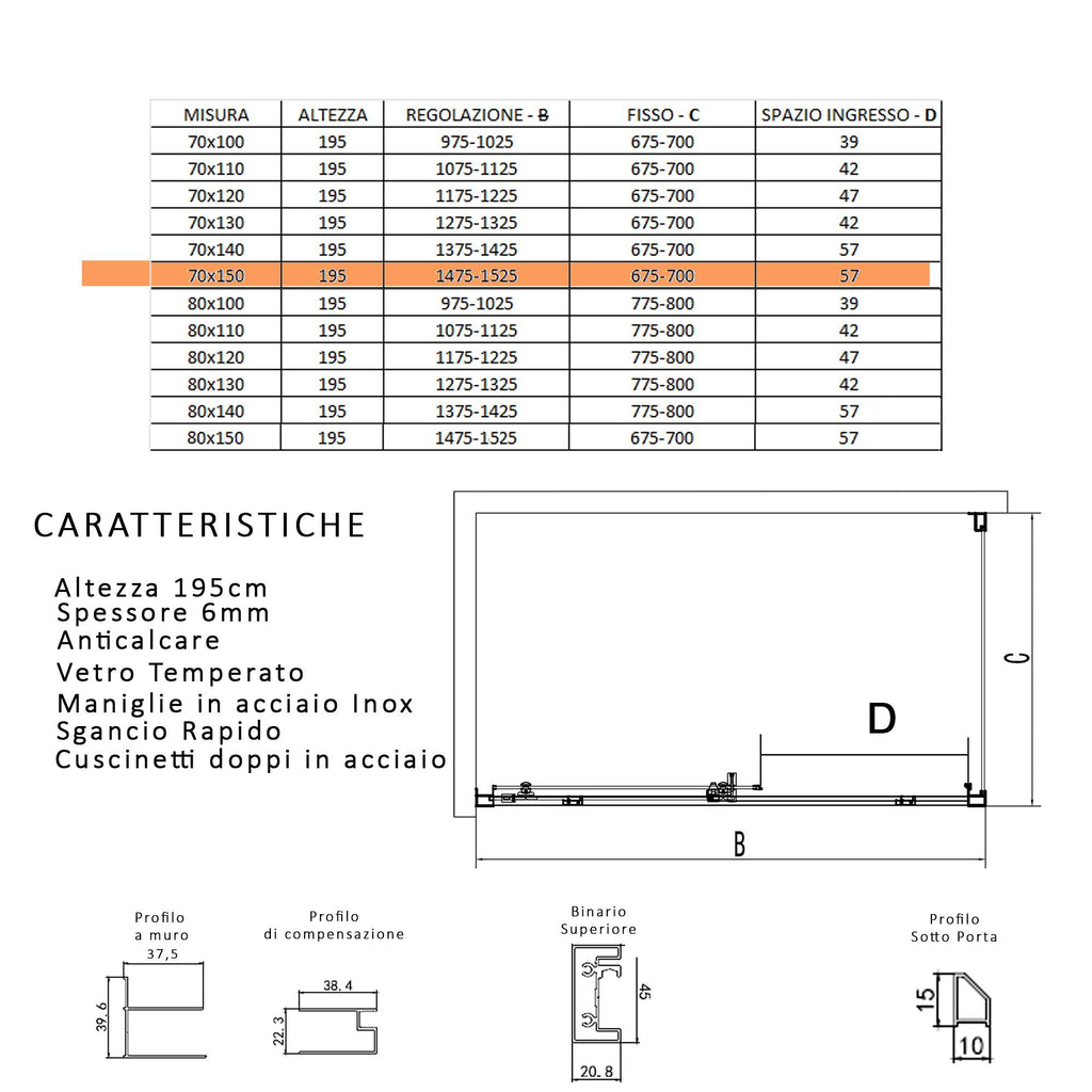 Cabine de douche 2 faces avec entrée frontale coulissante équipée d' une fermeture magnétique pour une parfaite étanchéité à l'eau, cristal de 6 mm avec traitement anti-calcaire qui empêche la formation de calcaire et facilite le nettoyage en permettant l' élimination des impuretés uniquement avec de l'eau chaude. Il vous permet de faire des économies en n'ayant plus à acheter des produits spécifiques. Peut être installé au ras du sol ou sur un receveur de douche . Roues en acier inoxydable et téflon.