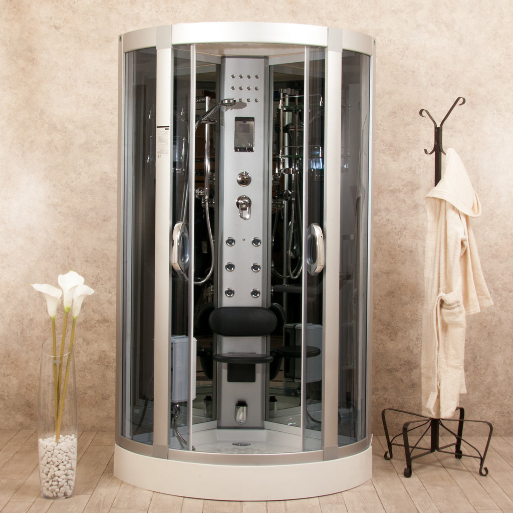Cabine de douche d'hydromassage semi-circulaire Eden, avec une colonne entièrement équipée au centre d'innombrables fonctions, fabriquée uniquement avec des matériaux d'excellente qualité certifiés et garantis et assemblée avec soin dans les moindres détails.
