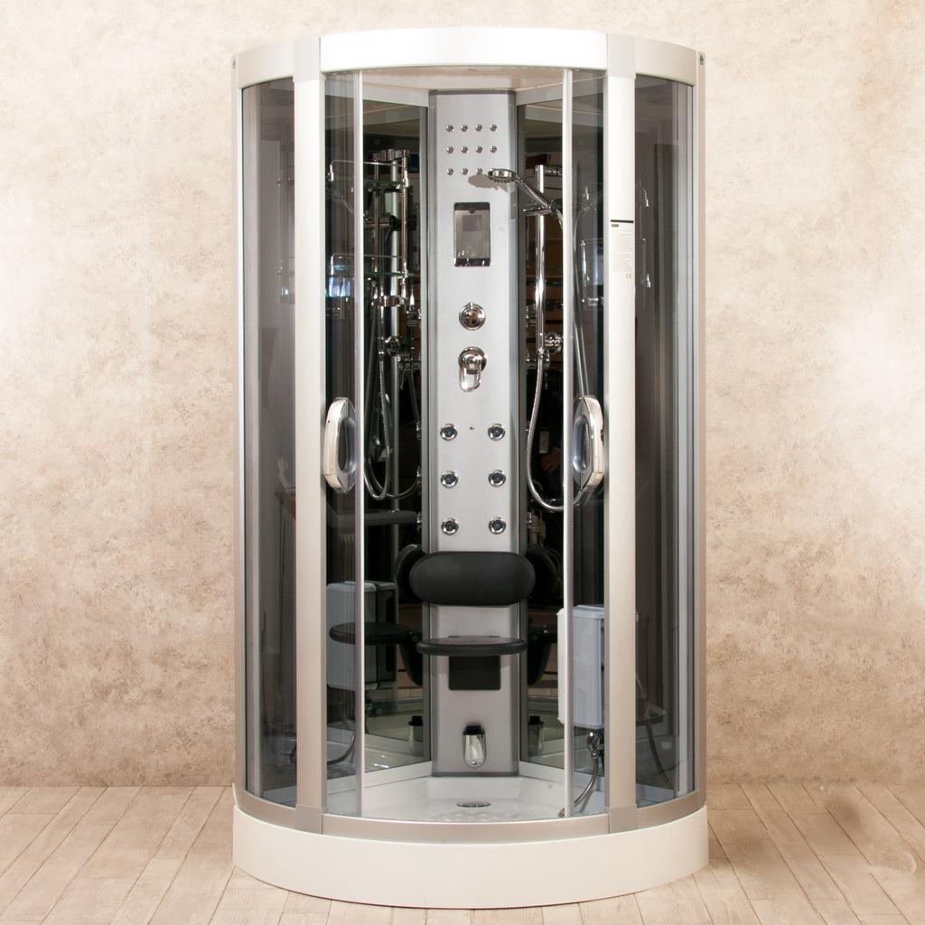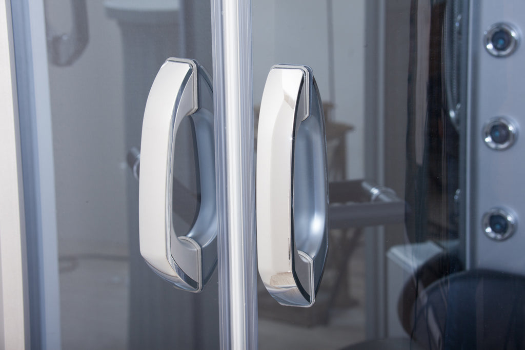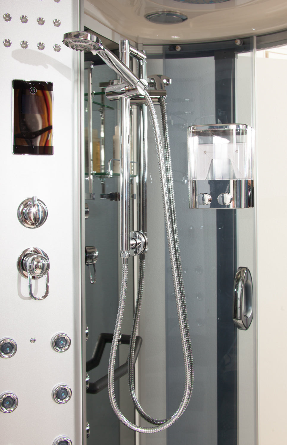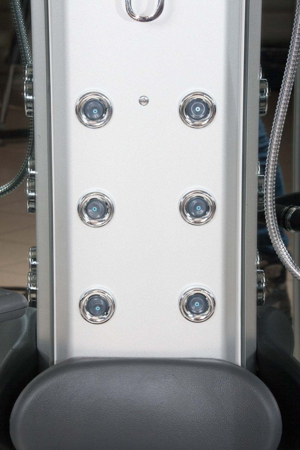 Complet avec receveur de douche en résine ABS antidérapante résistante, verre fumé trempé anti-casse, anti-fragmentation de 5 mm, profilés porteurs en aluminium ultra-résistants, éclairage intérieur pour une douche émotionnelle grâce à l'atmosphère magique de la lumière LED, vapeur hotte, radio, récepteur téléphonique, pomme de douche centrale, rail coulissant, 6 puissants jets d'hydromassage pour les épaules et le dos, réglage des jets, massage des pieds, écran tactile numérique, porte-bouteille pour bain moussant.