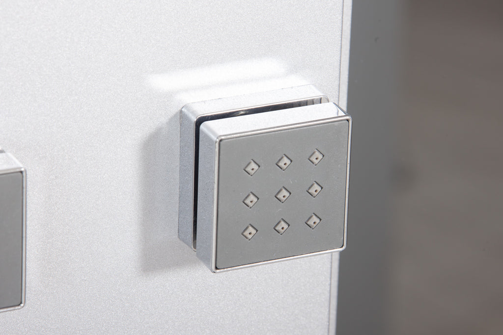 Profils de support en aluminium, éclairage LED interne, extracteur de vapeur, radio, récepteur téléphonique, pomme de douche centrale, rail coulissant, 6 puissants hydrojets réglables pour les épaules et le dos réglables, affichage numérique à écran tactile pour sélectionner toutes les fonctions de douche souhaitées, générateur de vapeur pour le bain turc aux effets relaxants et tonifiants, un porte-bouteille pour bain moussant ou autre.