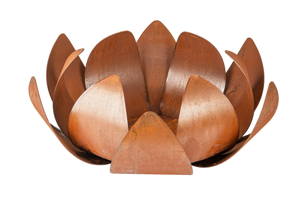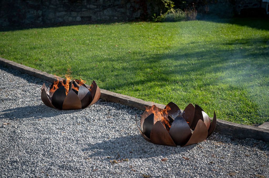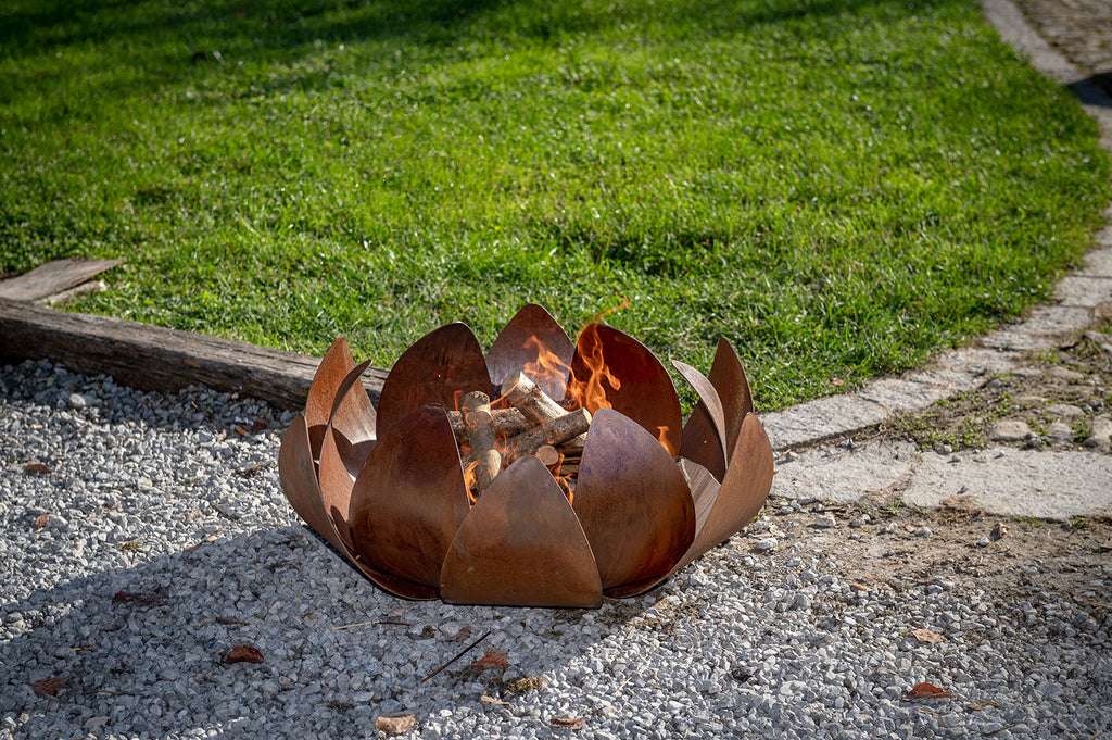 Braciere a Legna Struttura a Petali Sovrapposti Ninfea in Acciaio Corten Effetto Ruggine