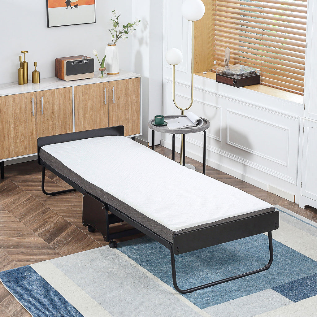 Vous souhaitez toujours avoir un lit à portée de main pour accueillir un invité chez vous ? Equipez-vous de ce lit pliable : résistant et stable, vous l'ouvrez et le fermez facilement sans avoir besoin d'aide. Ce lit simple pliable est livré avec un matelas confortable et a une conception peu encombrante qui vous permet de le ranger dans un petit espace. Les roues pivotantes vous permettent également de le déplacer sans effort où vous le souhaitez.