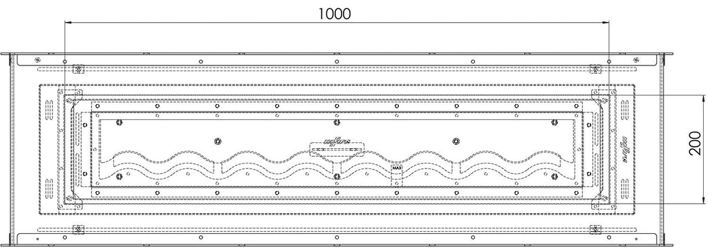 Un inserto in fibra ceramica con rete aumenta la sicurezza, prolunga e ottimizza il processo di combustione. La striscia scorrevole consente di regolare la dimensione della fiamma e spegnere il camino in sicurezza , mentre la forma ad onda crea un ulteriore effetto 3D.