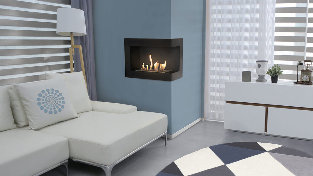 Une Bio-Cheminée d'Angle horizontale ouverte sur le côté droit est la solution idéale pour encastrer dans un angle de la maison.