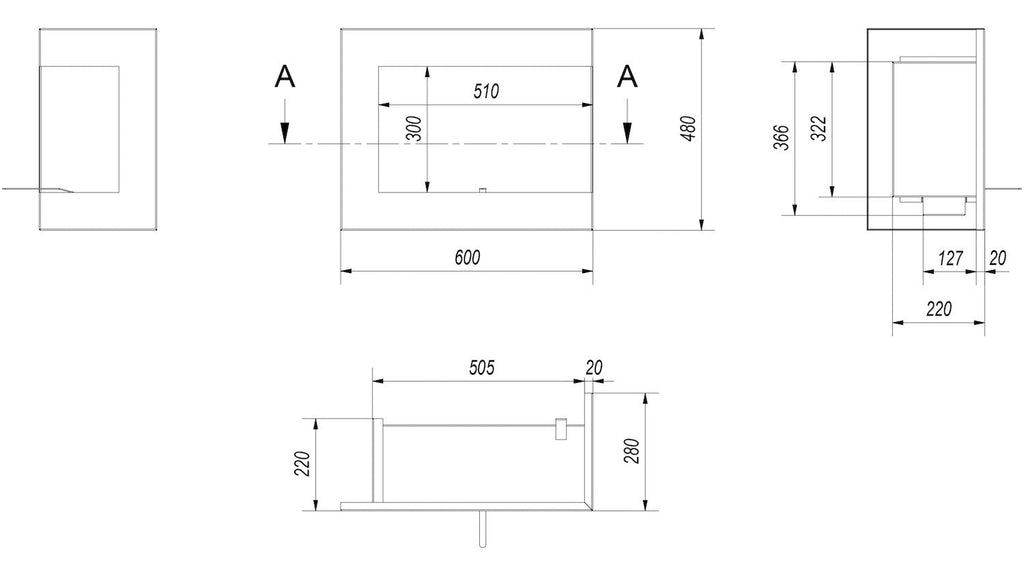 Caractéristiques Techniques Cheminée Bioéthanol Encastrable 60x48x28cm Flig Tampa Noir avec et sans Vitre d'Angle Droite