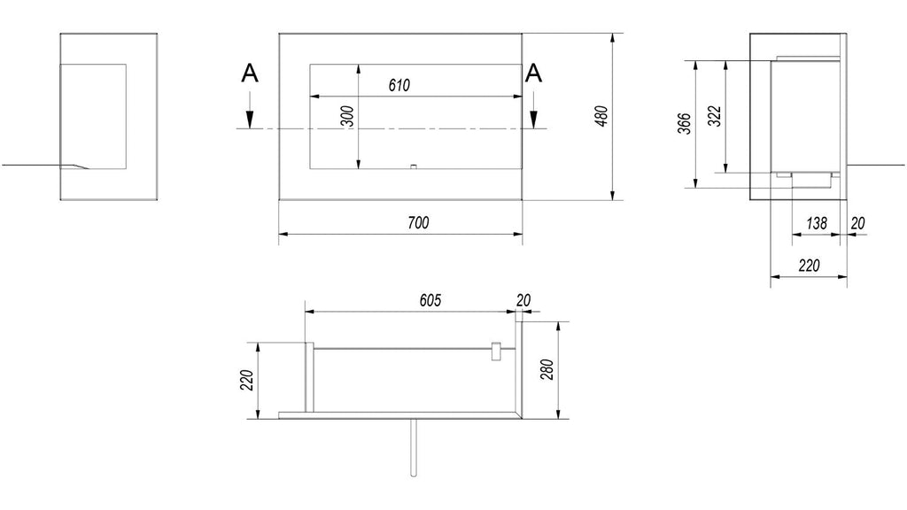 Caractéristiques Techniques Cheminée Bioéthanol Encastrable 70x48x28cm Flig Tampa Noir avec et sans Vitre d'Angle Droite