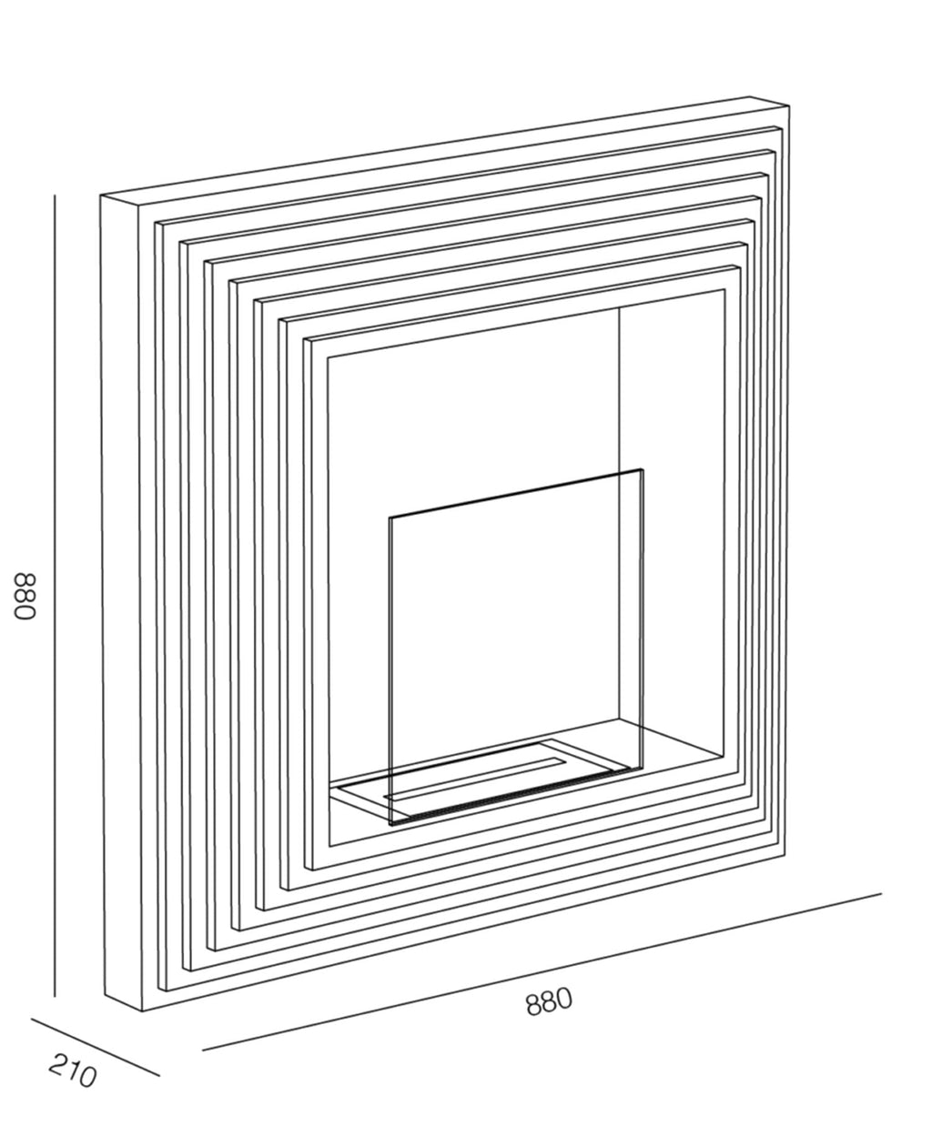 Camino a bioetanolo da incasso, struttura in acciaio verniciato nero con vetro di protezione. Dotato di bruciatore removibile con fibra e coperchio di chiusura fiamma. Installazione semplice che non richiede canna fumaria e allacciamento elettrico. Certificato secondo la normativa EN 16647:2016.