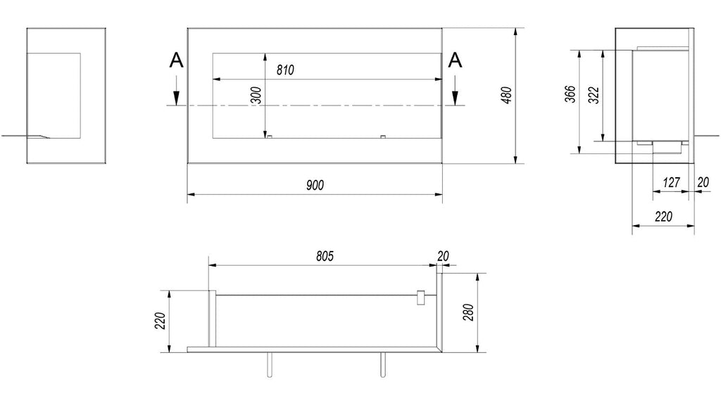 Caractéristiques Techniques Cheminée Bioéthanol Encastrable 90x48x28cm Flig Tampa Noir avec et sans Vitre d'Angle Droite