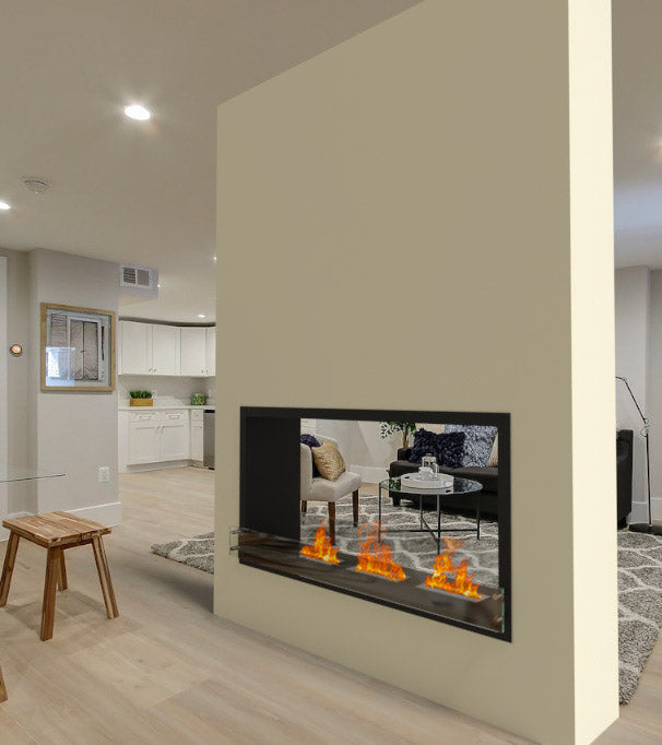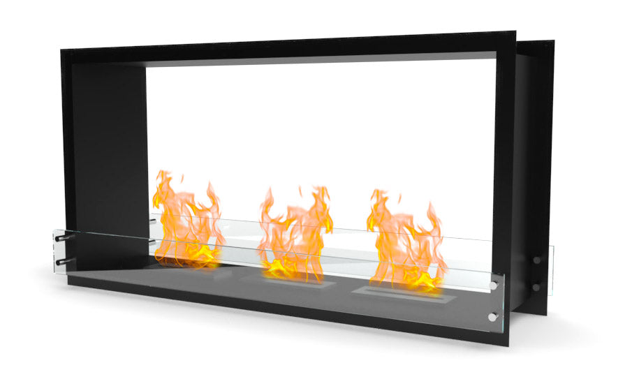 Cheminée au bioéthanol double face encastrable à insérer dans le mur ou dans une plaque de plâtre. D'une longueur de plus de 1,5 m, il est équipé de deux verres pour protéger la flamme et de 3 brûleurs de 1,2 l/chacun. Appliquer une couche d'isolant qui protège le mur de la chaleur (isolant non présent dans l'emballage).