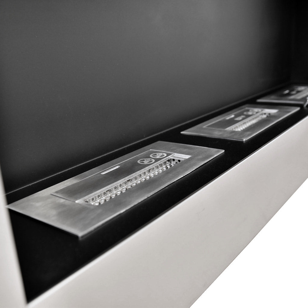 Un cadre en acier qui entoure trois éclairs de flammes comme s'il s'agissait d'un tableau : tel est l'impact visuel généré par la Keira, une biocheminée encastrable avec trois brûleurs de 1,5 litre, idéale pour être insérée dans des cavités murales préexistantes.