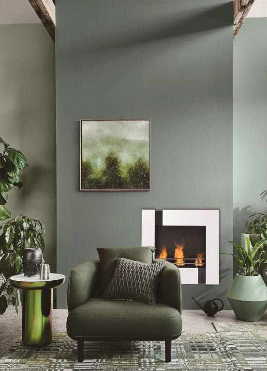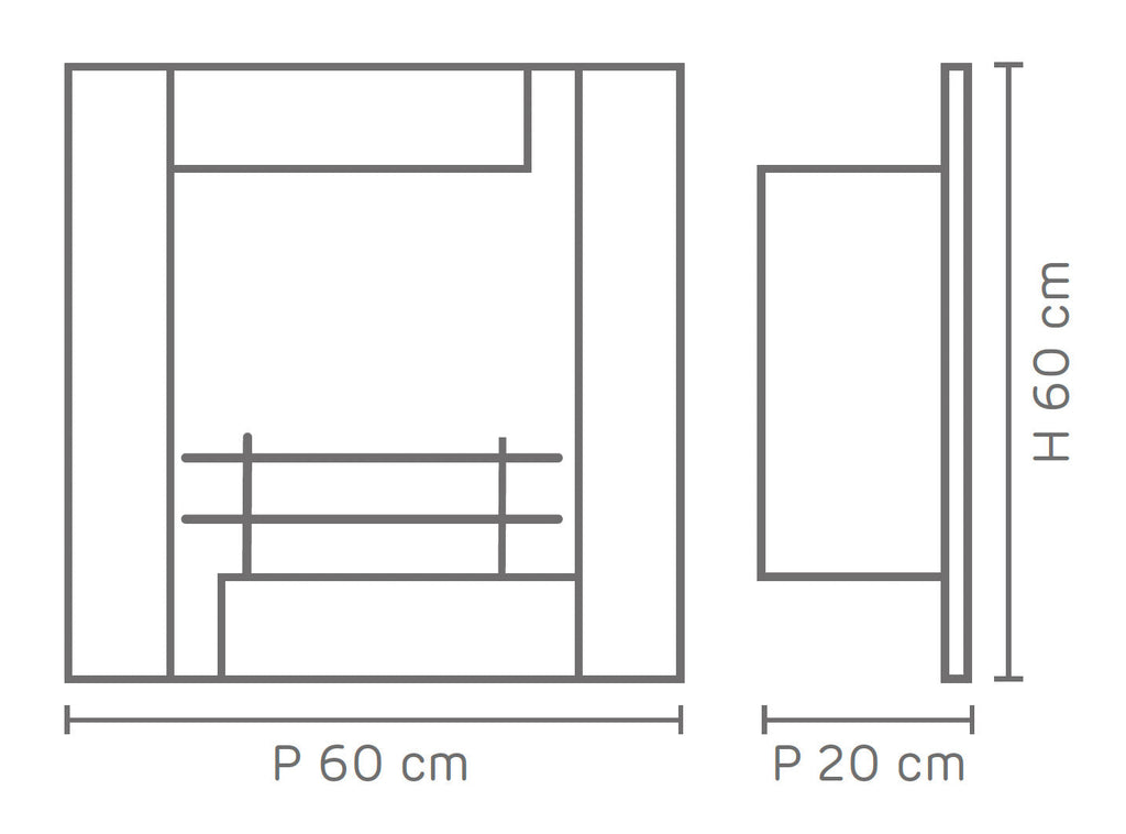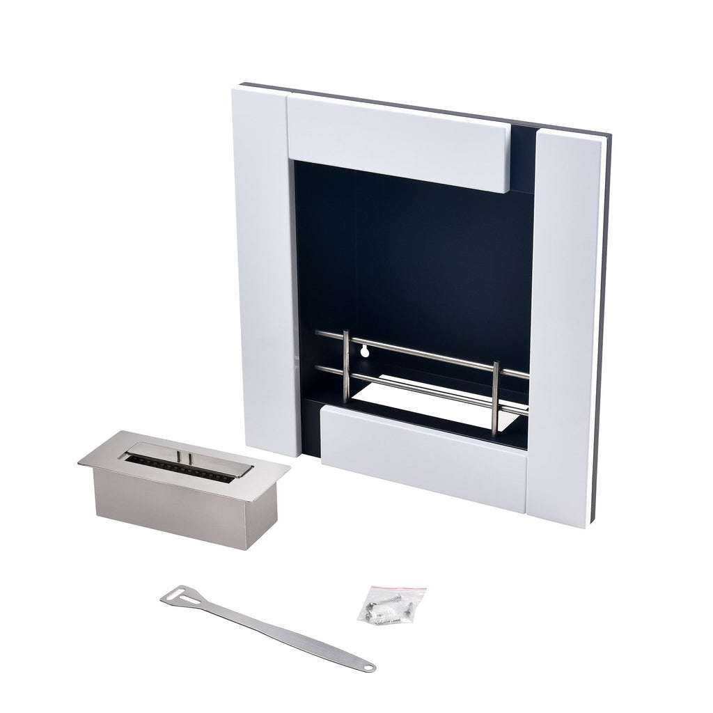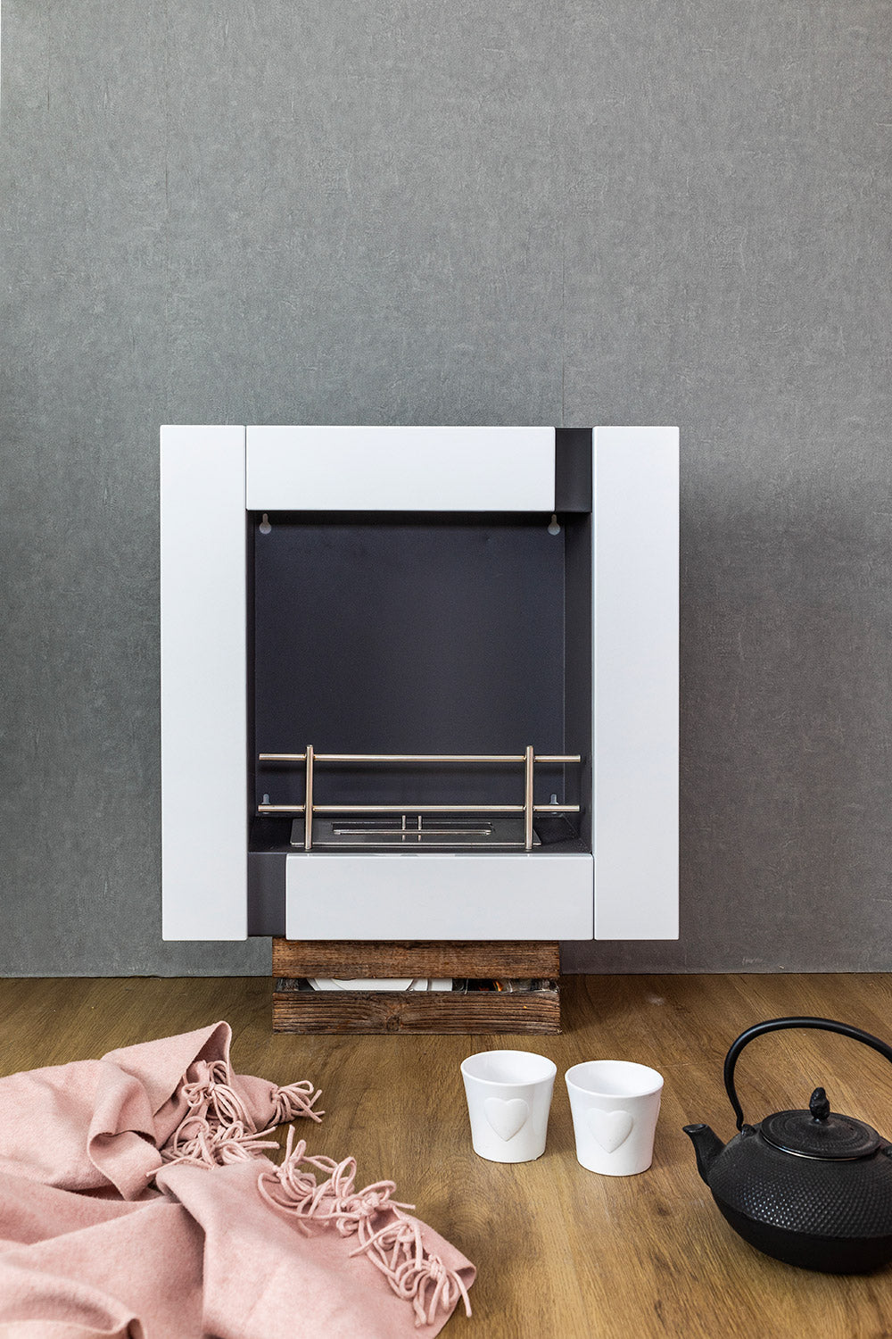 Camino a bioetanolo da parete o da incasso con bruciatore da 1,2 lt, certificato EN 16647, con lana di roccia. Inserto in acciaio verniciato nero. La scocca è in legno MDF dipinto bianco, resistente al calore. Dotato di doppia sbarra in metallo a protezione della fiamma. Kit di montaggio incluso.