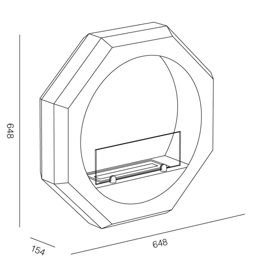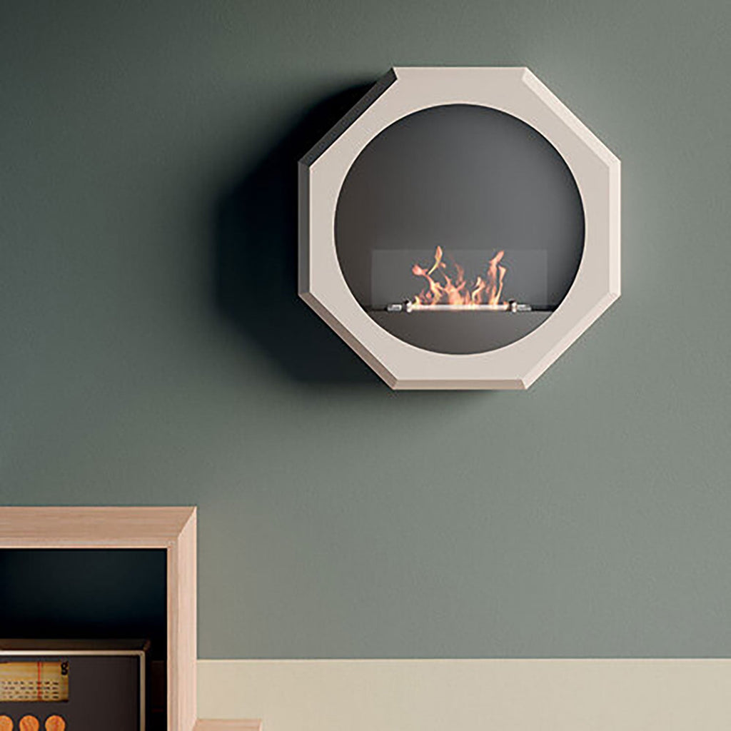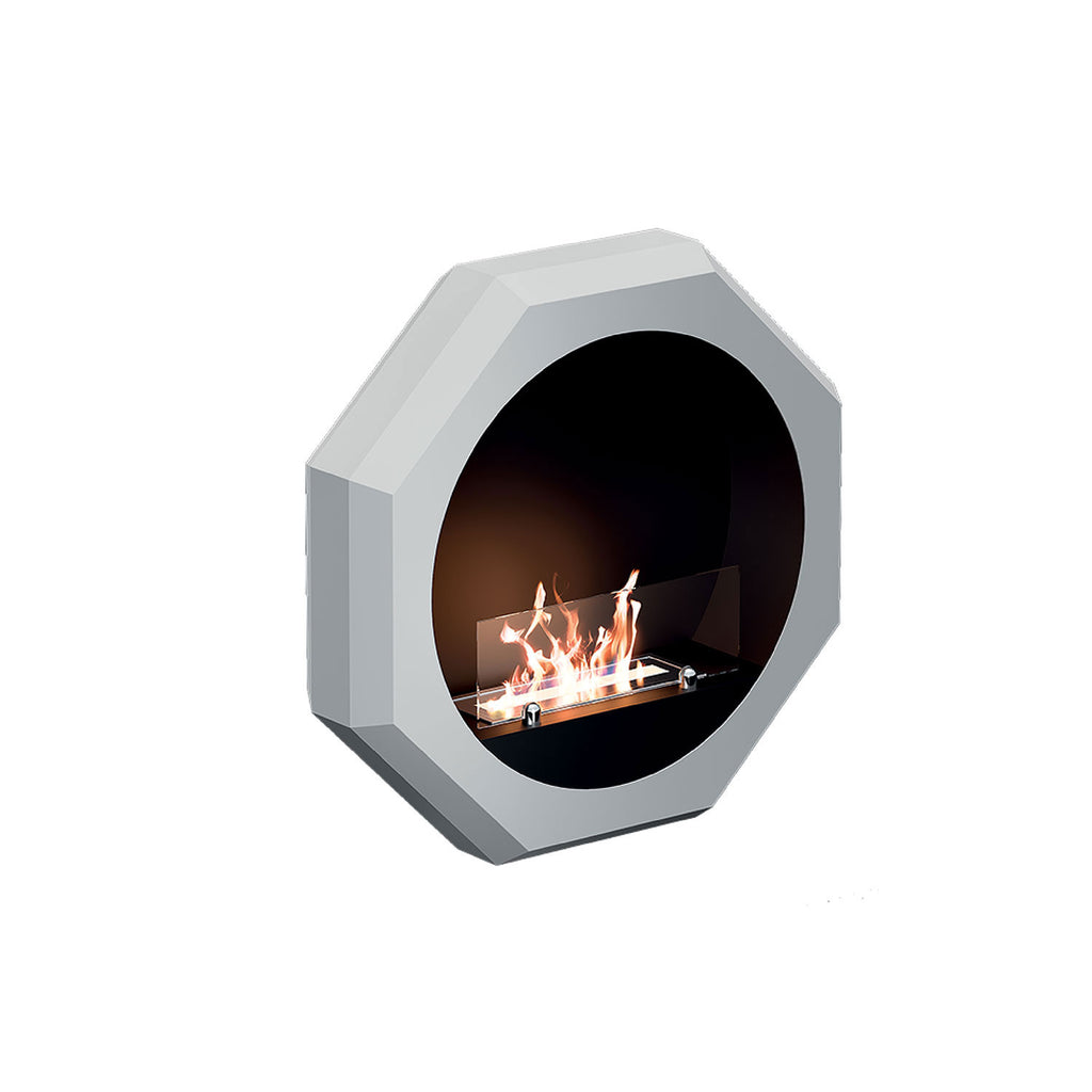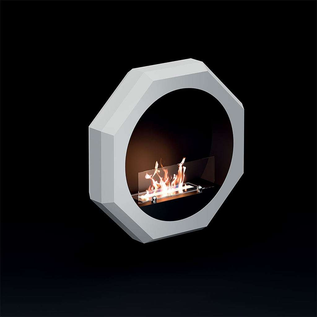 Camino a bioetanolo da parete, struttura in acciaio verniciato bianco e focolare nero, con vetro di protezione. Dotato di bruciatore removibile con fibra e coperchio di chiusura fiamma. Installazione semplice che non richiede canna fumaria e allacciamento elettrico. Certificato secondo la normativa EN 16647:2016.
