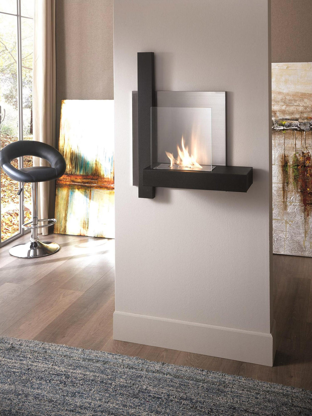 Cheminée murale en métal peint noir et acier satiné .