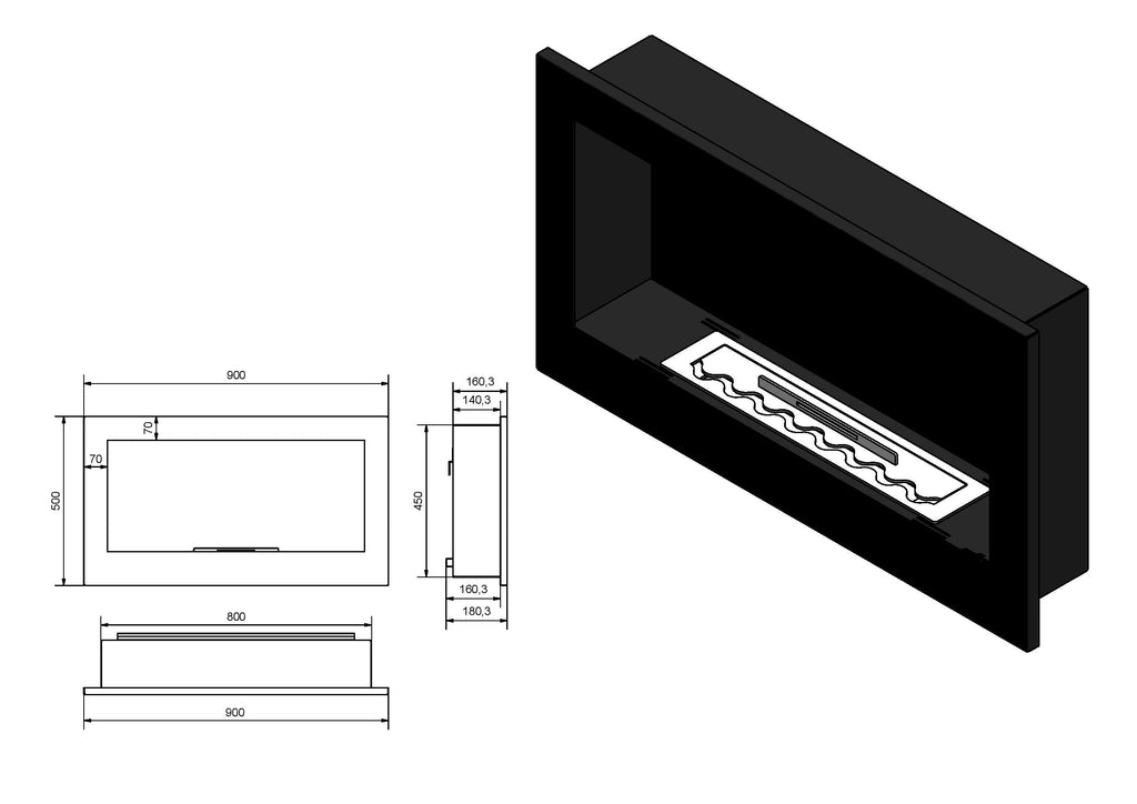 Caractéristiques Techniques Cheminée Murale Bioéthanol 90x50x18 cm Intérieur 900 Noir avec Verre