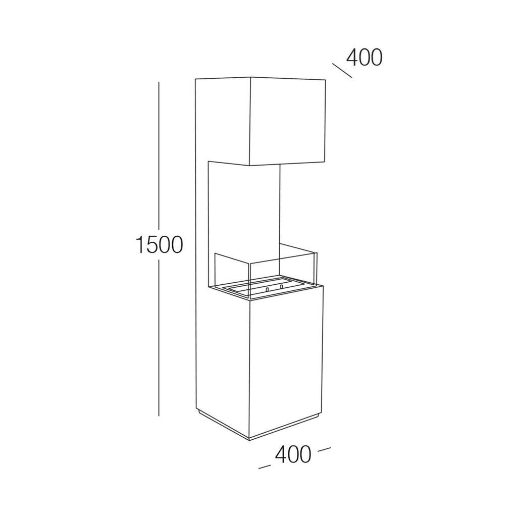 Camino a bioetanolo da pavimento, struttura in acciaio verniciato con 3 vetri temperati di protezione. Dotato di bruciatore removibile con fibra e coperchio di chiusura fiamma. Installazione semplice che non richiede canna fumaria e allacciamento elettrico. Certificato secondo la normativa EN 16647:2016.