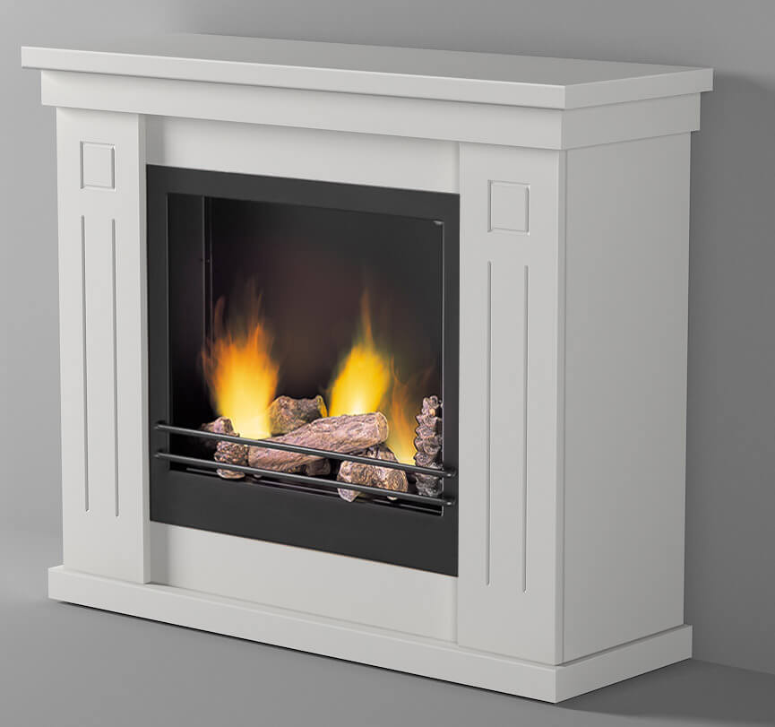 Foyer écologique avec manteau en bois blanc travaillé. Il est équipé de 3 brûleurs de 340 ml chacun qui développent une puissance maximale de 3,5 kw/h. Equipé de bûches en céramique ignifuge.