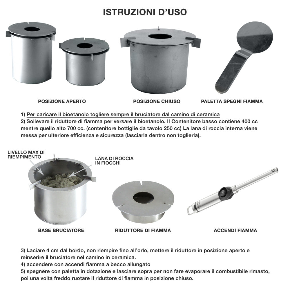 Nos cheminées sont fabriquées en faïence avec deux cuissons entièrement à la main dans notre laboratoire. La majolique rayonne uniformément la chaleur via des rayons infrarouges bénéfiques similaires à ceux du soleil. Il ne nécessite pas de cheminée. Le bioéthanol est un distillat de betteraves ou de céréales, naturel, inodore, ne dégage pas de fumée et est non toxique. La combustion ne produit que du dioxyde de carbone. Nous vous recommandons d'aérer la pièce au moins une fois par jour. La chaleur produite n'est pas dispersée par le conduit de fumée et reste dans la pièce avec un rendement énergétique de 100 %. Le pouvoir calorifique est supérieur à 0,716 kw dérivant de la simple combustion horaire du bioéthanol, puisque la céramique absorbe la chaleur ou la rayonne comme un radiateur. La consommation est d'environ 100 cc par heure. Le brûleur est en acier inoxydable et comprend la lame de l'extincteur.