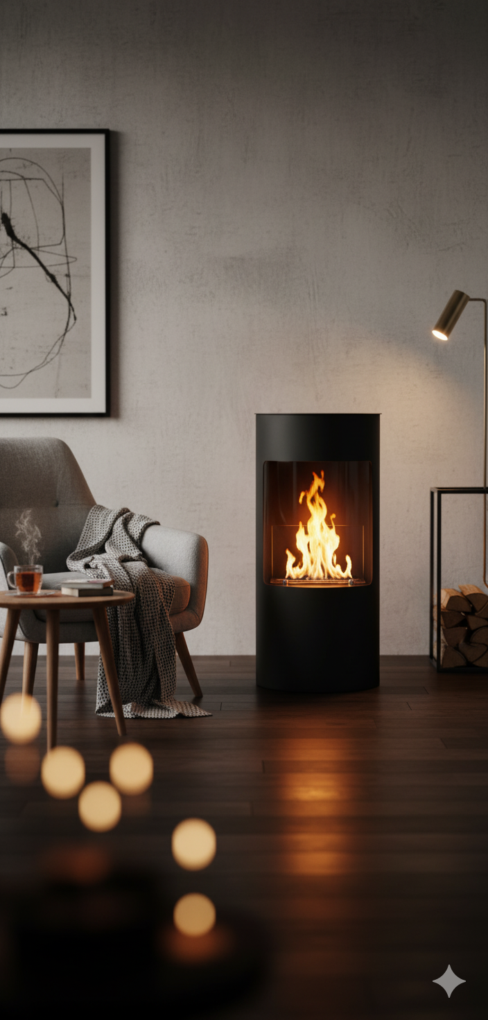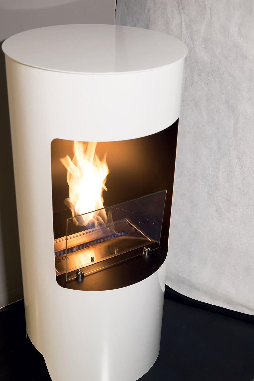 Élégance et raffinement pour cette biocheminée qui, grâce à son design et sa forme, peut également faire office de petit poêle.