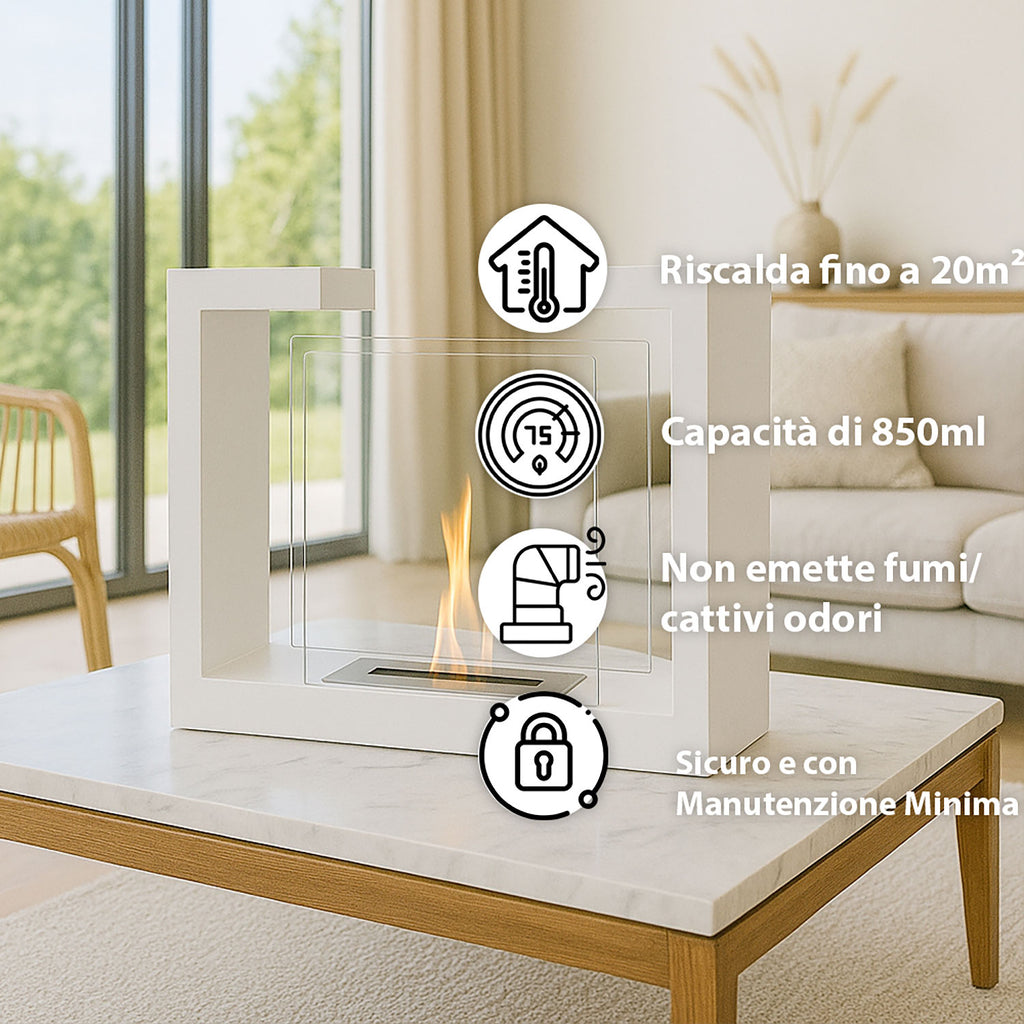 Funziona con bioetanolo, una fonte di energia ecologica che non richiede canna fumaria né elettricità, nessun odore, nessun fumo, nessuna manutenzione invasiva.