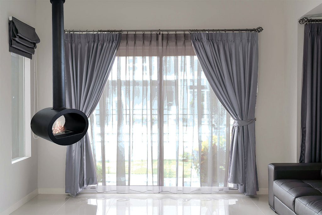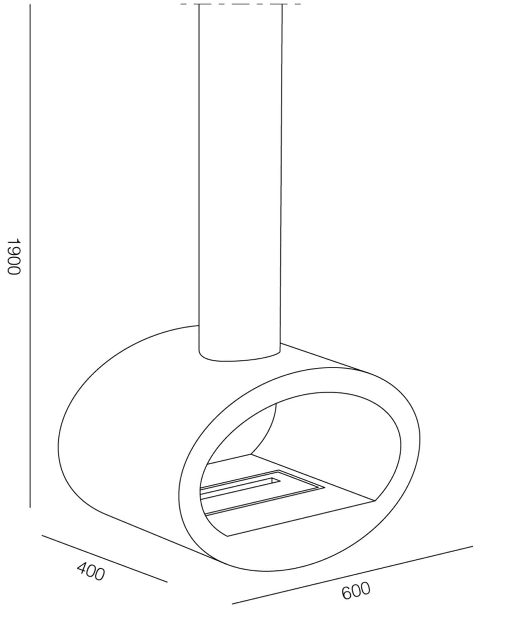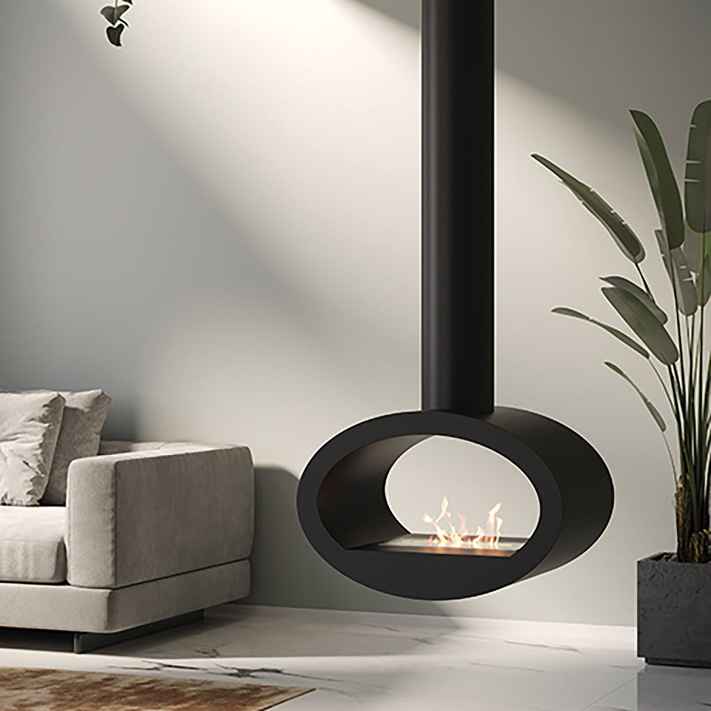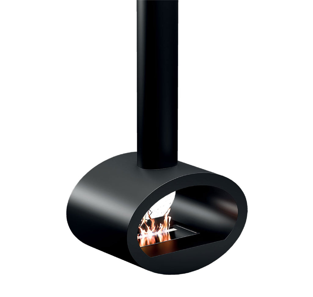 Camino a bioetanolo sospeso, con struttura in acciaio verniciato nero e installazione a soffitto. Dotato di bruciatore removibile con fibra e coperchio di chiusura fiamma. Installazione semplice che non richiede canna fumaria e allacciamento elettrico. Certificato secondo la normativa EN 16647:2016.