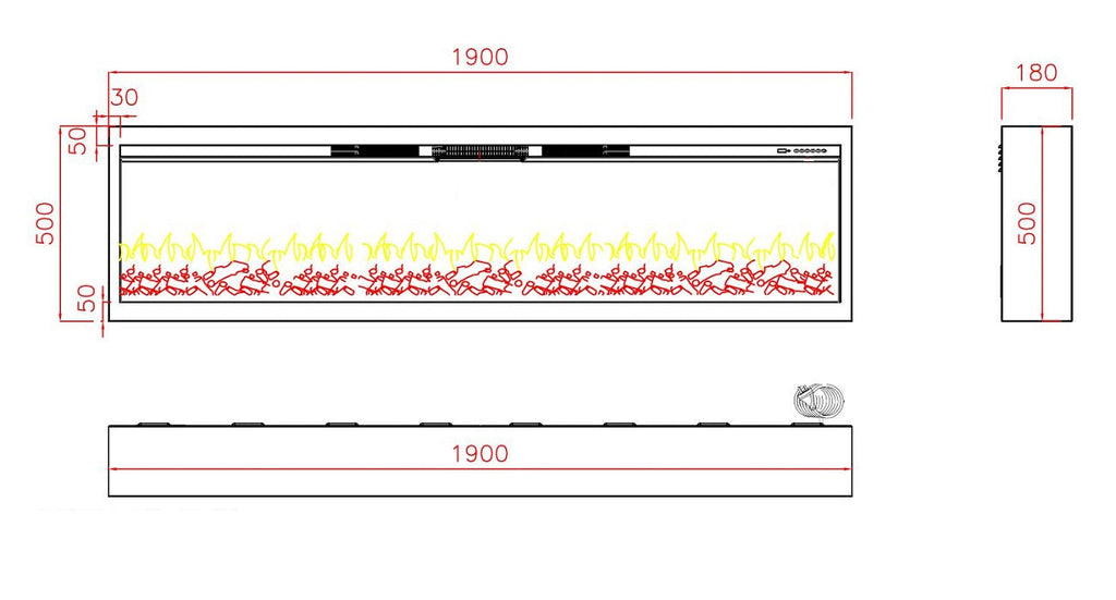 Cheminée électrique encastrable 50x18x190 cm 1500W Effet Flamme Sined Stromboli Noir