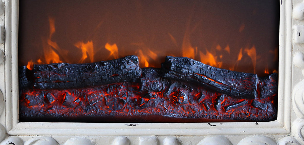 Cheminée électrique suspendue de style shabby avec effet de flamme réaliste et lit de braises. Equipé d'une télécommande et d'une fonction de réglage de la luminosité de la flamme. Kit de fixation murale inclus.