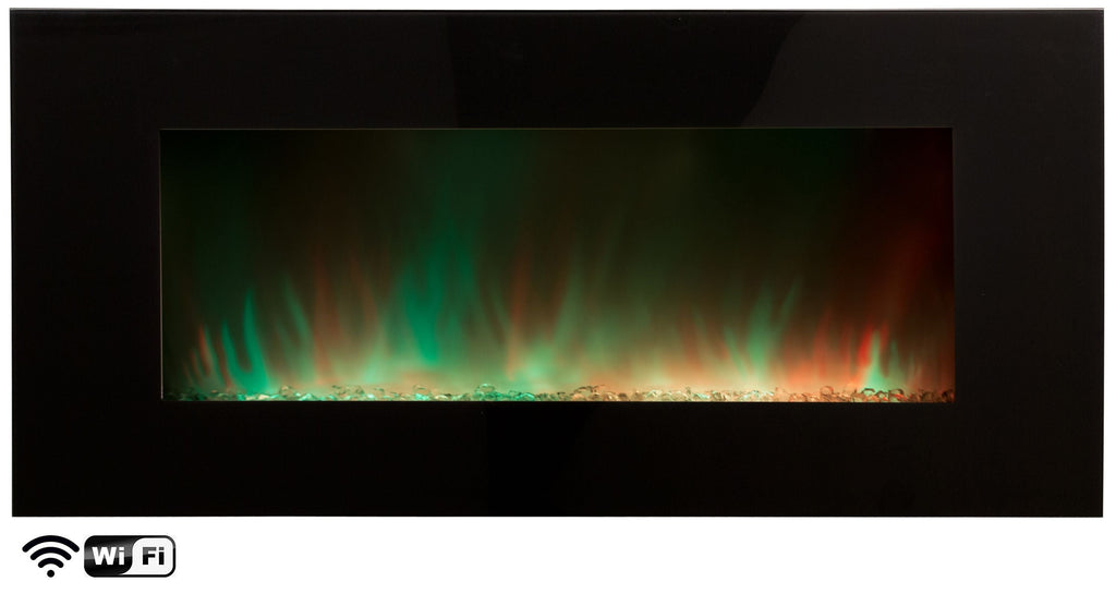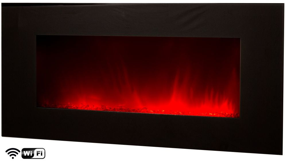 Cheminée murale modèle WIFI Volcano XXL avec éclairage LED avec changement de couleur : 12 couleurs dont les variantes de rouge, vert, bleu, jaune. Grâce à l'application, disponible pour Android et iPhone, vous pouvez régler le thermostat, la programmation horaire et quotidienne directement depuis votre téléphone mobile. Effet flamme ultra réaliste grâce aux LED avec technologie Chemin'Arte. Il chauffe et meuble une pièce d'environ 30 m2. Télécommande incluse.