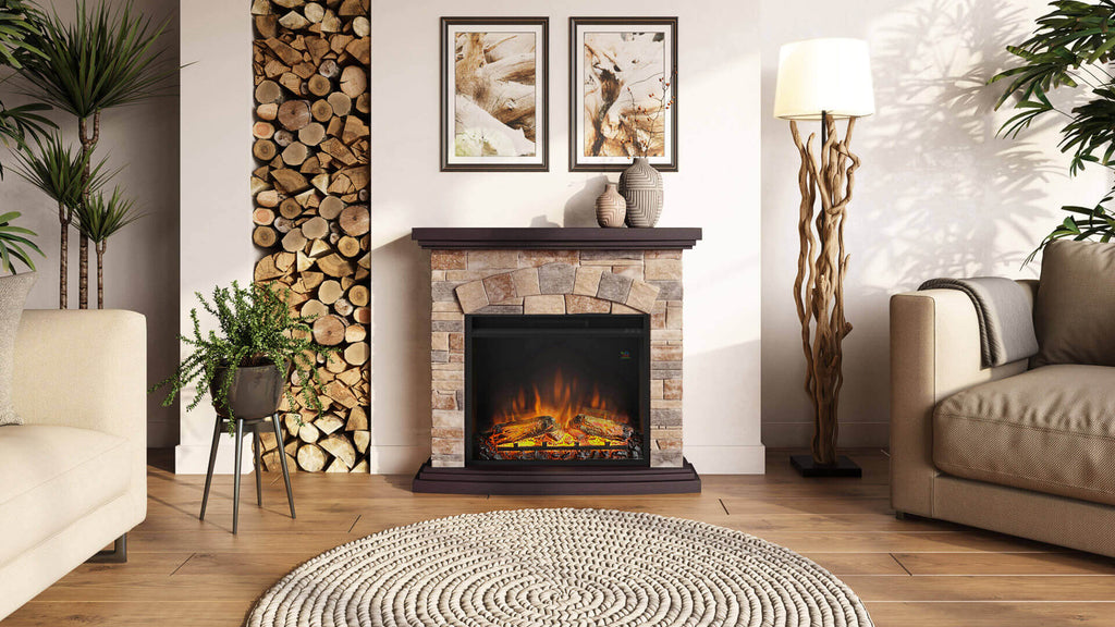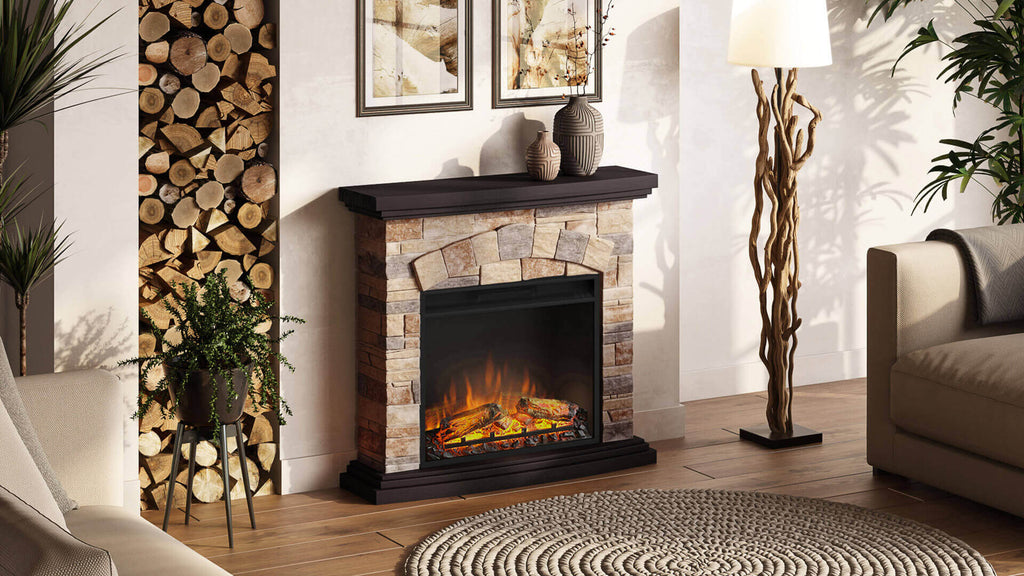 Foyer électrique à cadre en bois Tori 1500W avec insert de foyer électrique de 23 pouces, télécommande, couleur effet pierre.