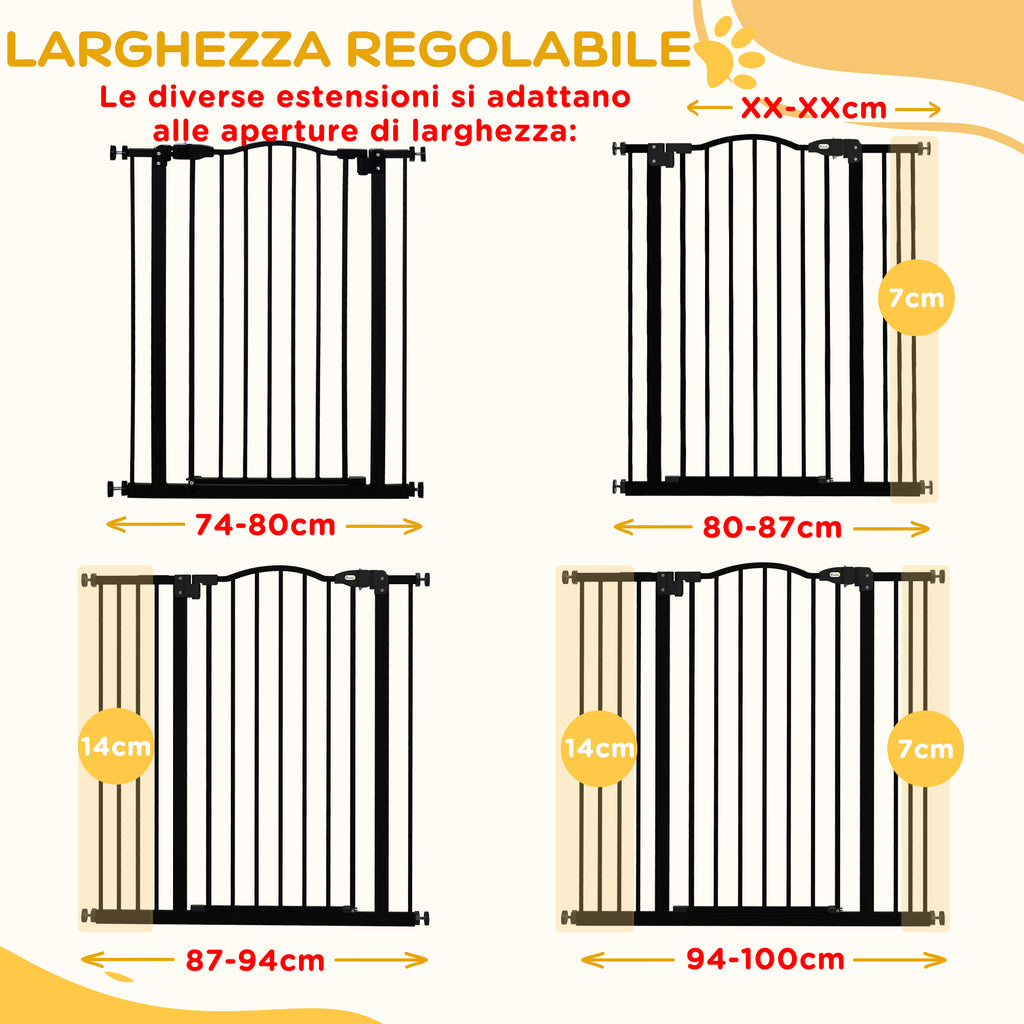 - DESIGN REGOLABILE: Il nostro cancelletto di sicurezza per cani possiede un'altezza di 94 cm ed è adatto a un'apertura che va da 74 a 100 cm. La struttura consente di bloccare le scale, le porte delle camere da letto, i corridoi e altre aree all'interno della casa per una maggiore sicurezza degli animali domestici