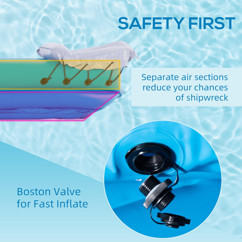 - SÉCURISÉ : Composé de 11 sections gonflables, ce canoë 2 personnes est conçu pour vous maintenir à flot à tout moment. En cas de crevaison d'une des sections, les 10 autres restent gonflées et vous aident à poursuivre la navigation