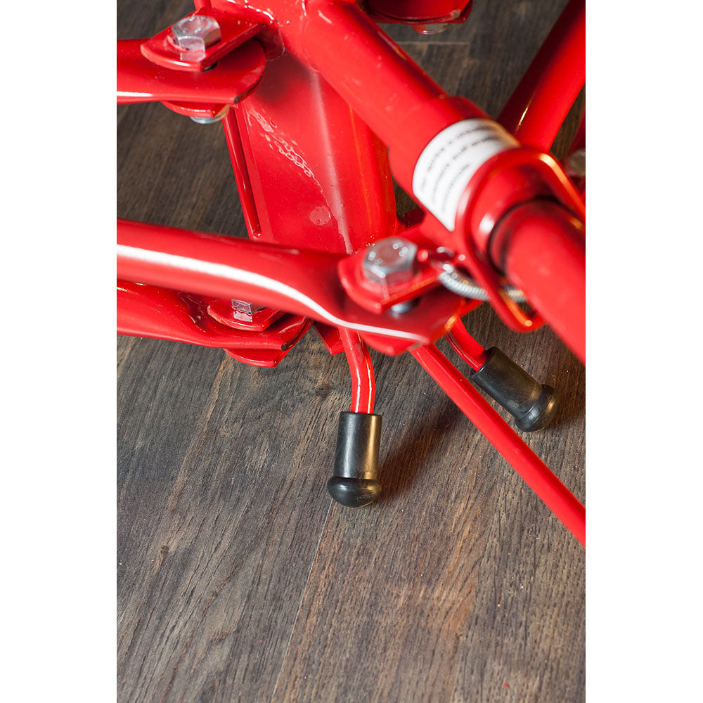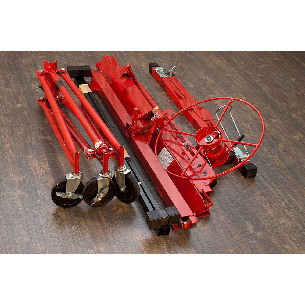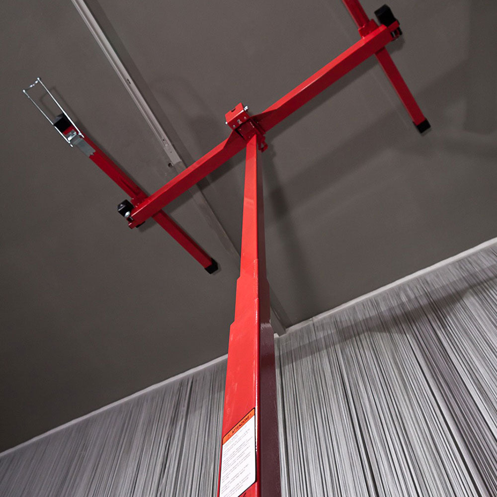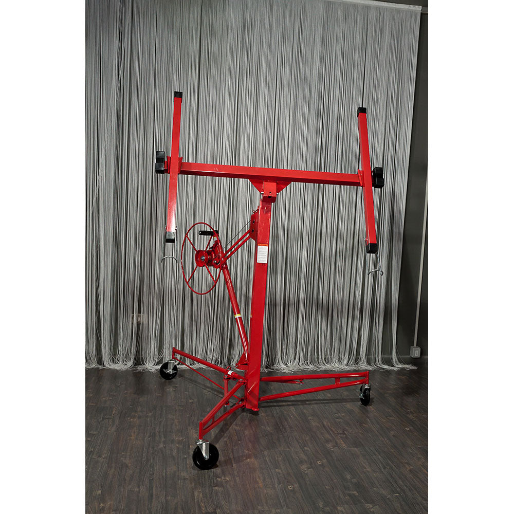 L'élévateur de dalles soulève des plaques de plâtre mesurant jusqu'à 1,20 m x 4,88 m , est entièrement réalisé en acier et est équipé de freins sur les trois roues. C'est un outil facile à refermer et à transporter grâce à son faible poids d'environ 40kg .