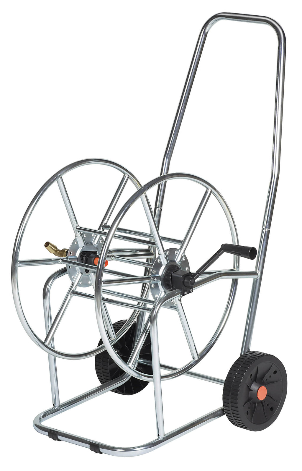 Chariot enrouleur semi-professionnel en acier. La finition zinc-chrome rend le chariot particulièrement élégant, ainsi que résistant aux agents extérieurs. Il peut collecter jusqu'à 80 mètres de tuyau 3/4", équipé d'une poignée en métal recouverte de plastique. Le chariot est fourni avec un support de tuyau en plastique et un support de tuyau tournant en laiton courbé, tous deux pour tuyau 3/4". Le châssis à deux supports et les roues robustes de grand diamètre garantissent une stabilité maximale et permettent de déplacer le chariot sans effort.