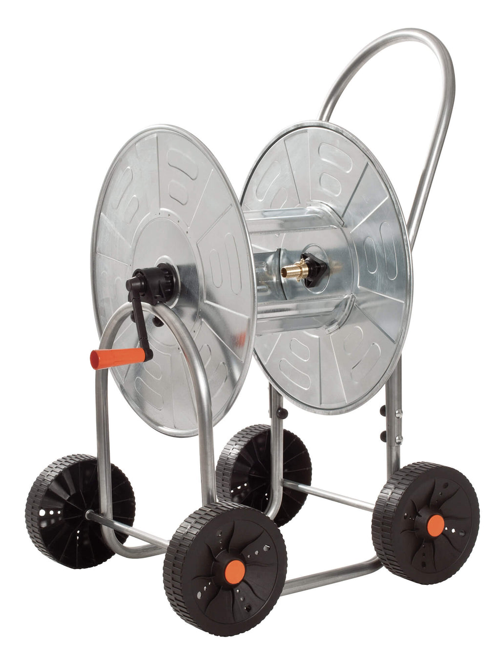 Carrello avvolgitubo professionale, realizzato in acciaio zincato.