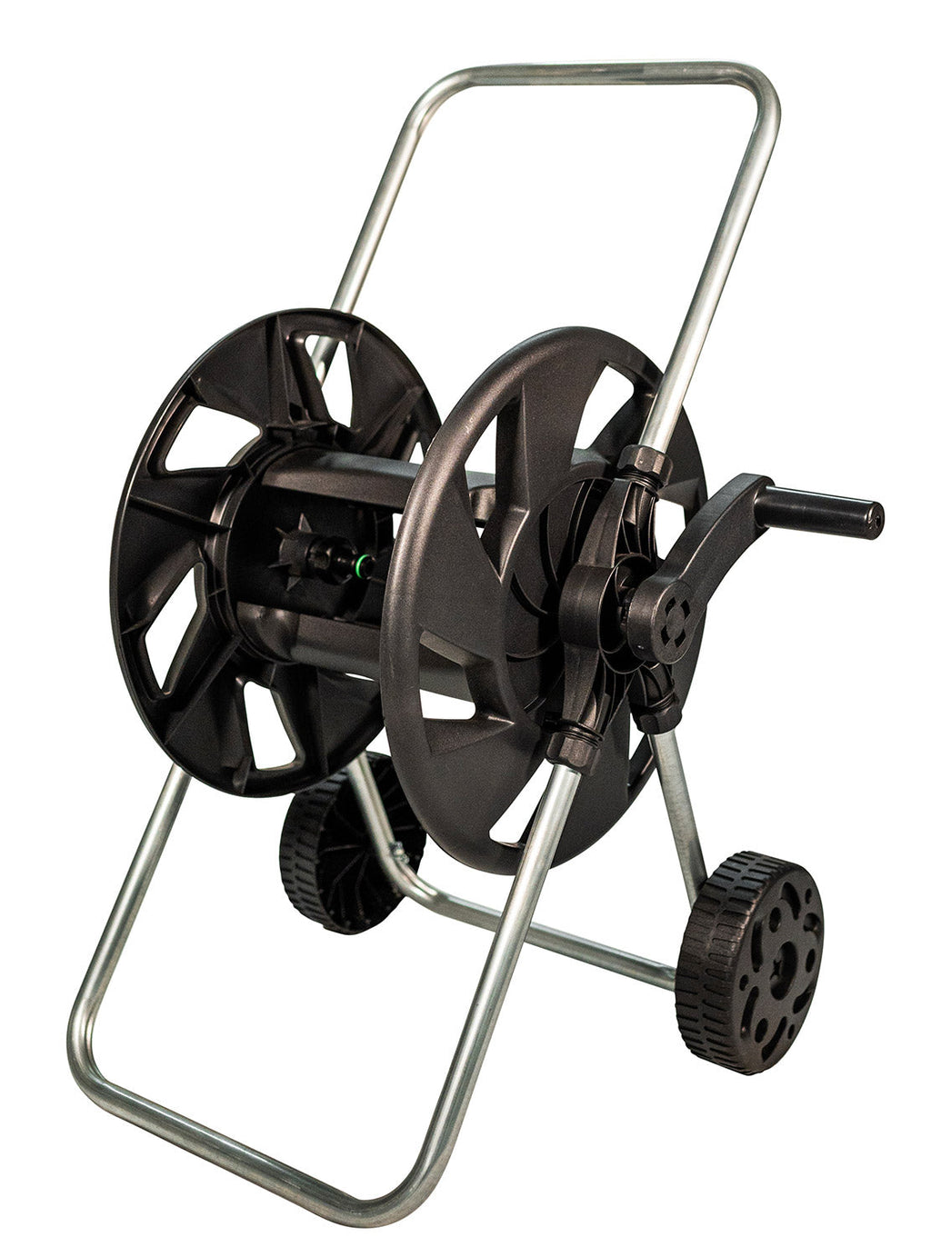 Chariot dévidoir avec châssis en acier galvanisé et rouleau en polypropylène. Il peut collecter jusqu'à 60 mètres de tuyau 1/2".