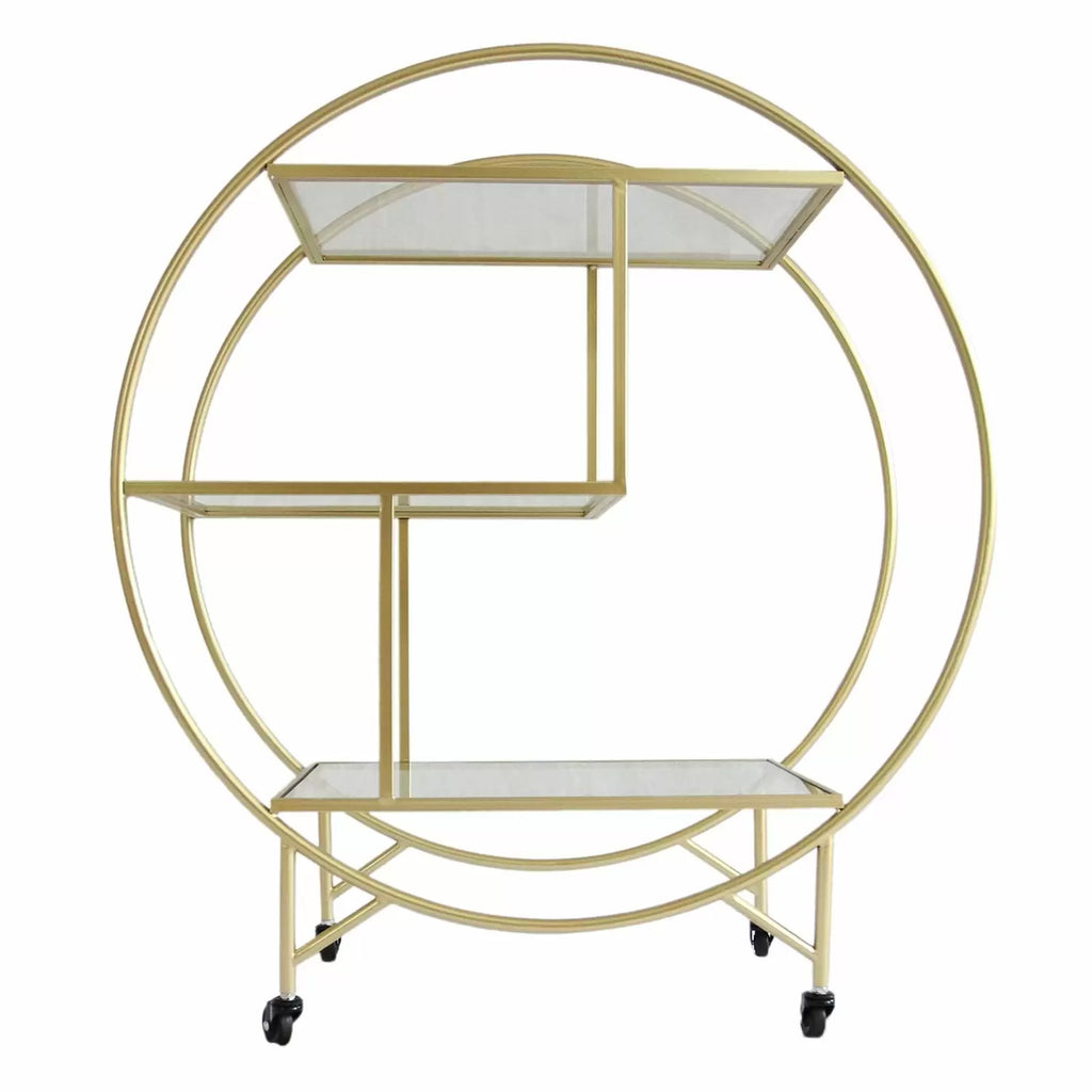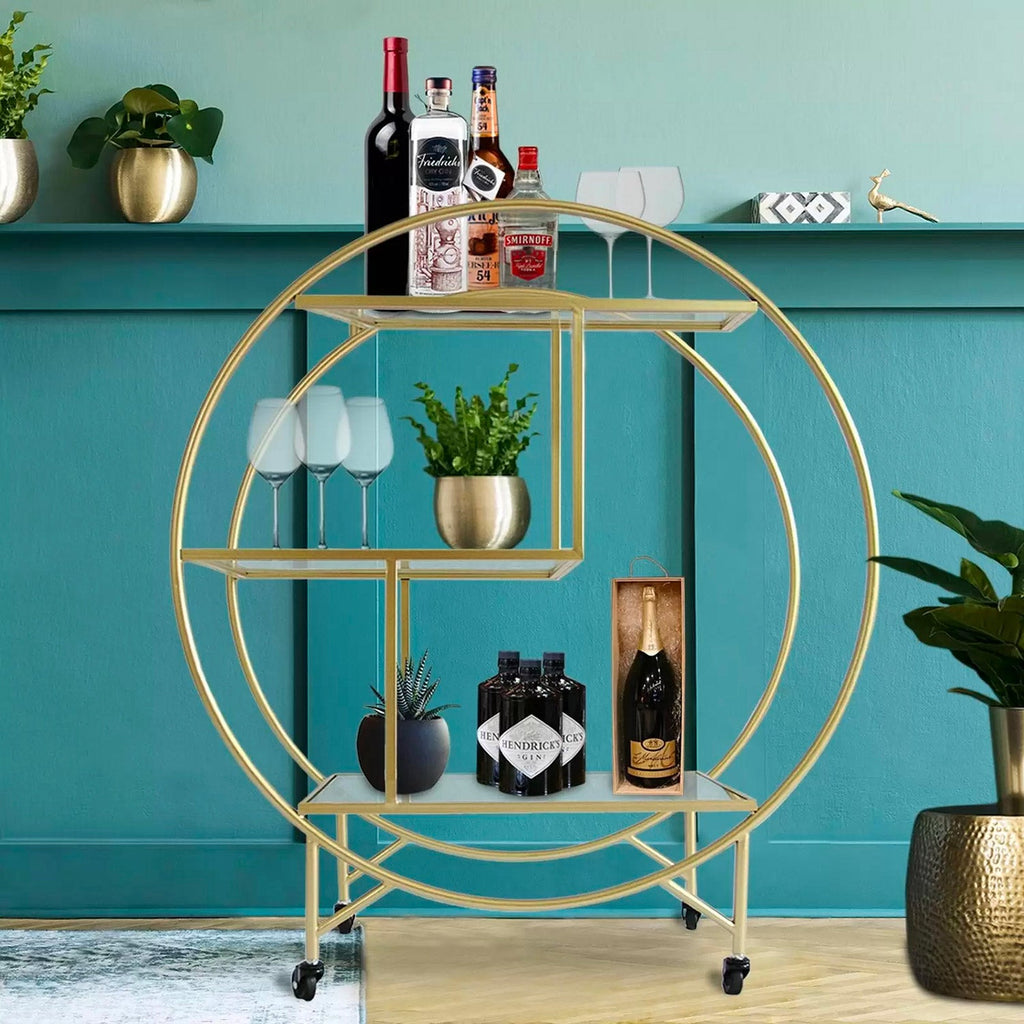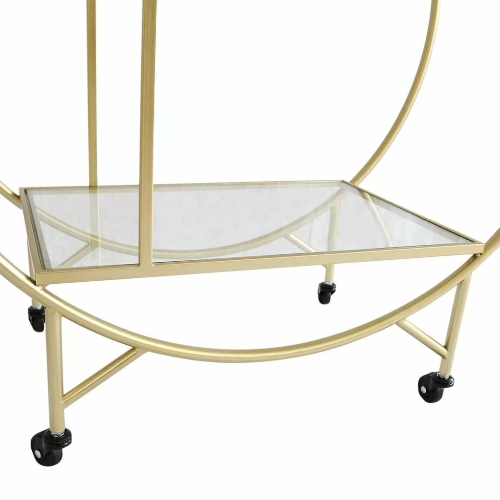 Ajoutez une touche sophistiquée à vos occasions spéciales avec le chariot à cocktail de style Art Déco, les roues robustes lui permettent de se déplacer en douceur tandis que le cadre en fer peint de couleurs métalliques donne une finition élégante, parfaite pour n'importe quel décor.