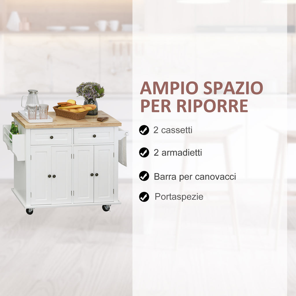 Chariot de cuisine avec tiroirs et étagère à épices 111x44,5x82,5 cm en bois blanc