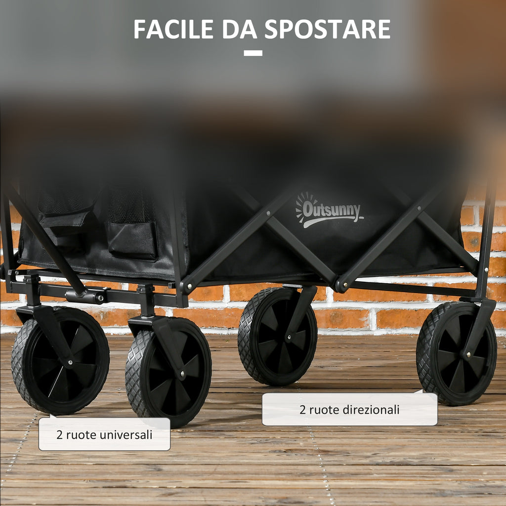 Carrello da Giardino 110L con Maniglia Telescopica e Tettuccio in Acciaio e Tessuto Oxford Nero